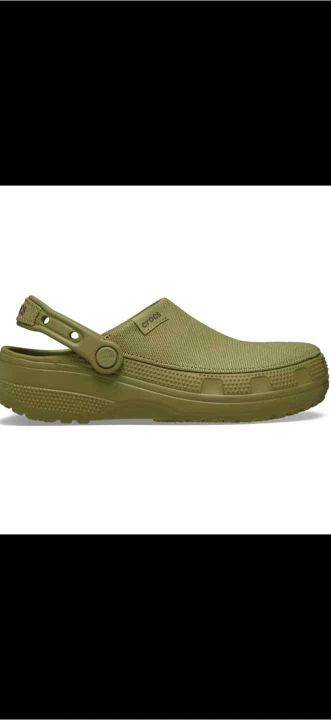 These Crocs All Terrain clogs are a versatile olive green. They feature a durable Croslite foam construction with a textured upper. Pivoting heel straps offer a secure fit for active wear.