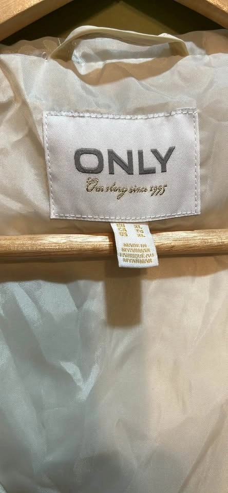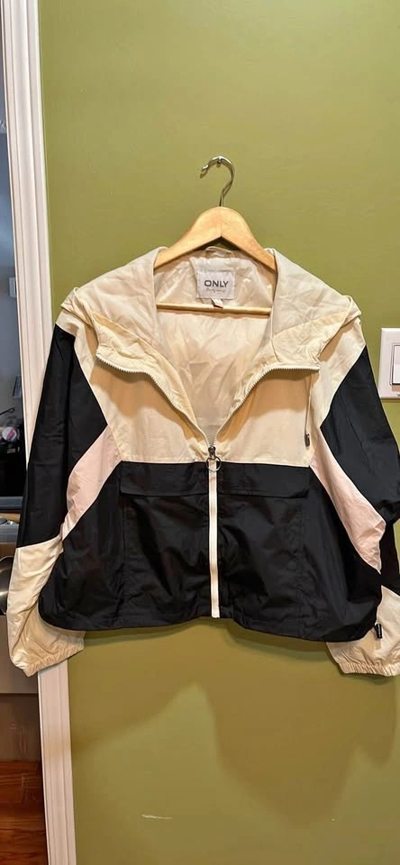 Stylish ONLY color block windbreaker jacket with black, white, and light pink sections. Features a full zip front, hood, and pockets. Size XL. Great for a light layer!