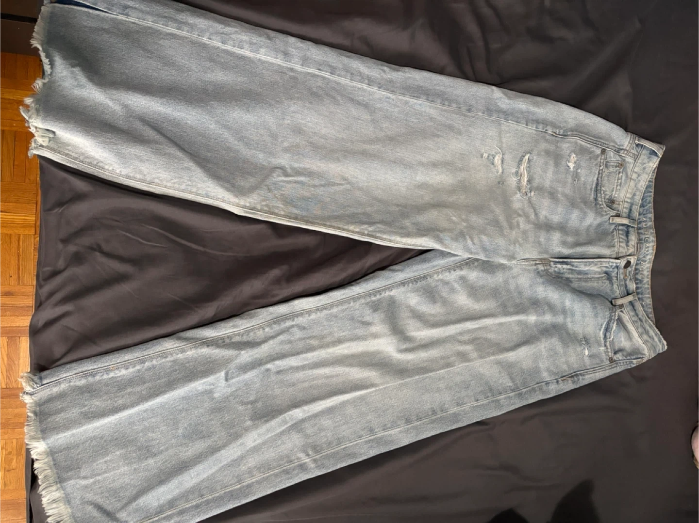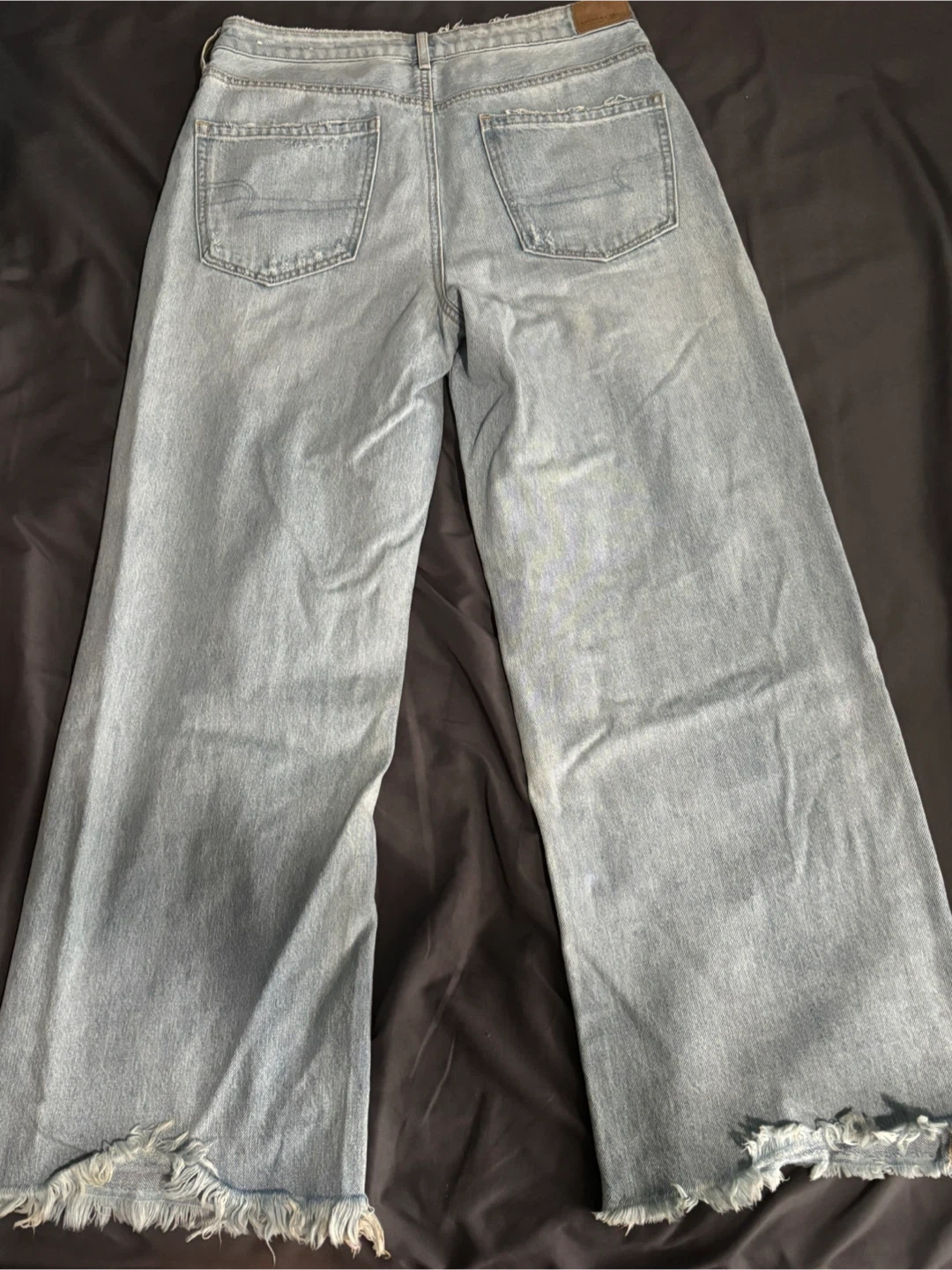 These are light wash denim jeans from American Eagle Outfitters. They're 100% cotton. The size is 10 Short. Bought over a year or 2 ago but never worn.