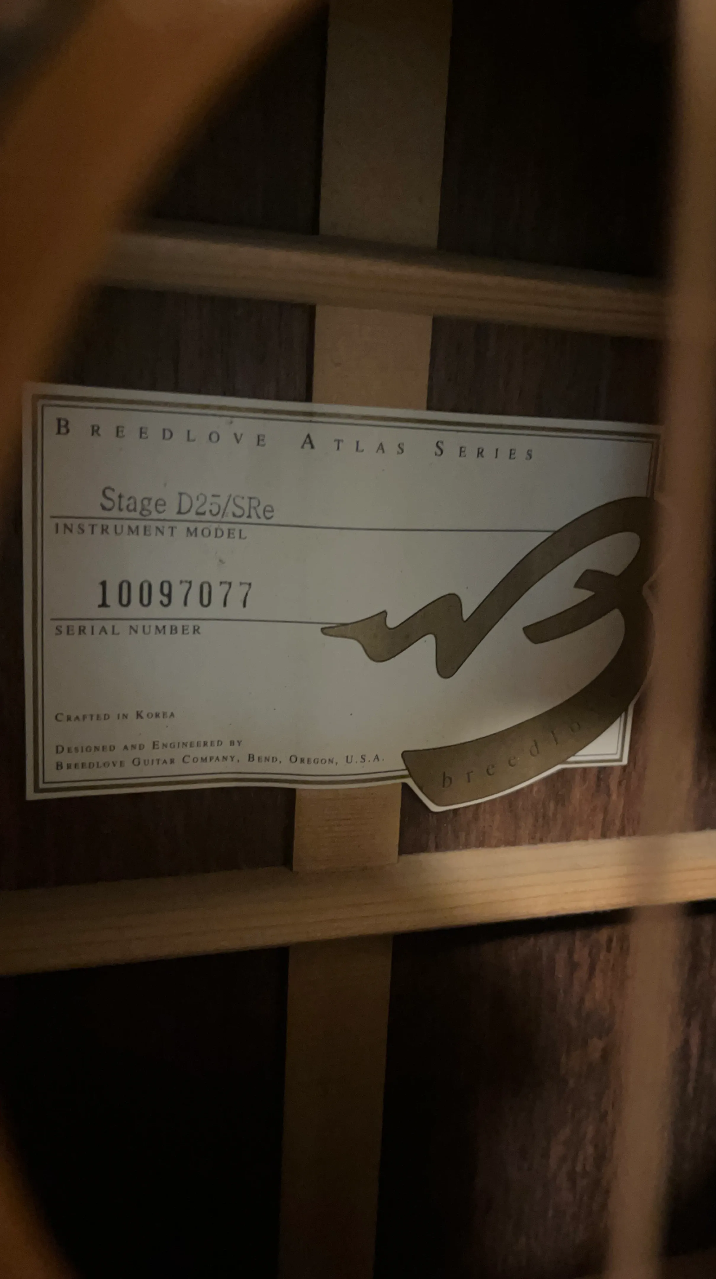 Breedlove Stage D25/SRe acoustic electric guitar, crafted in Korea. This instrument features a dreadnought cutaway body. It's ready for stage or studio.