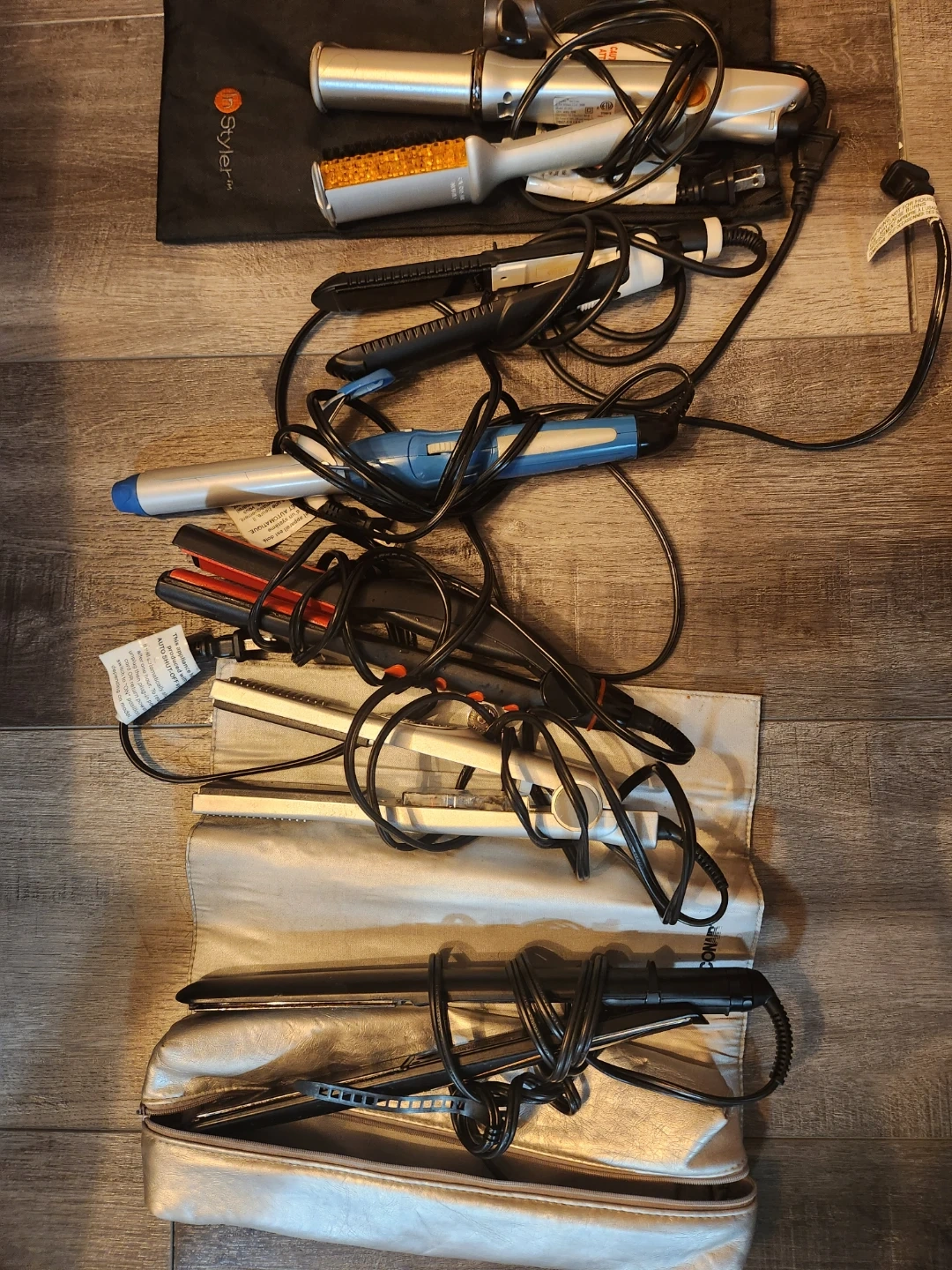 Bundle of various flat irons including InStyler hair styler. Includes curling wands and straightening irons. Some items come with a carrying case. Tools are in gently used condition. They are of good quality and work very well. Take all of them for $30.00.
