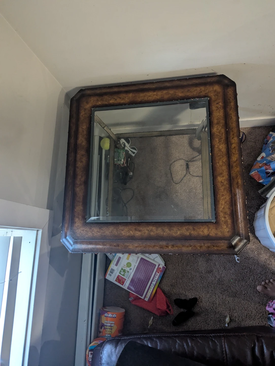 This end table features a glass top and a decorative wood-look frame with metal accents. Its metal base provides a sturdy structure. It's a good size for placing beside a sofa or chair.