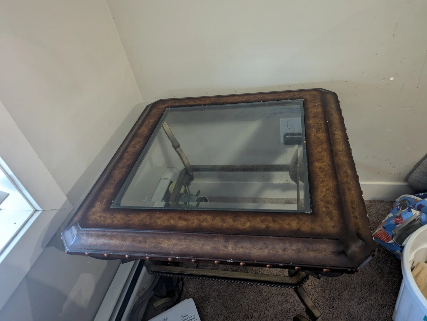 This end table features a glass top and a decorative wood-look frame with metal accents. Its metal base provides a sturdy structure. It's a good size for placing beside a sofa or chair.