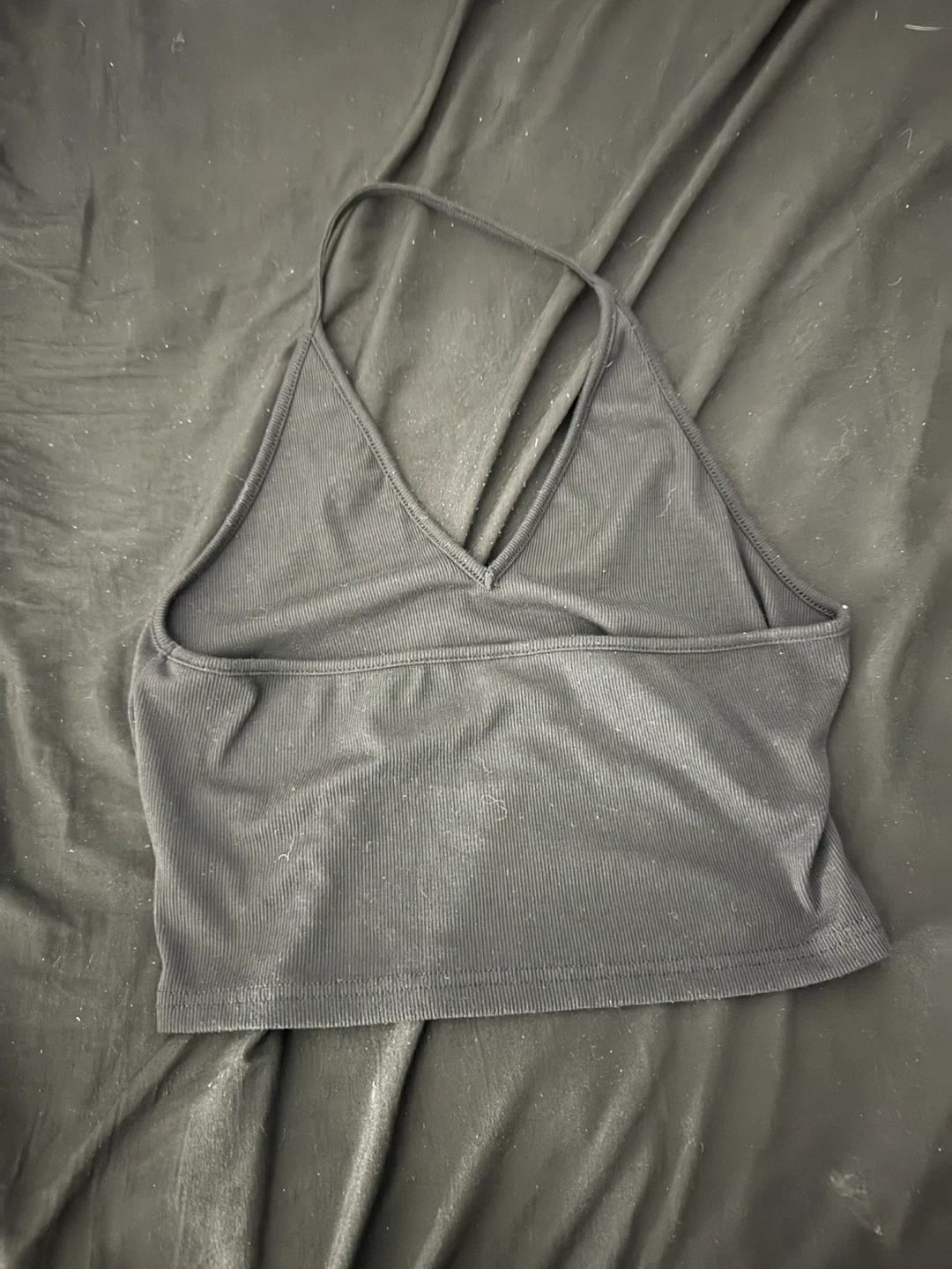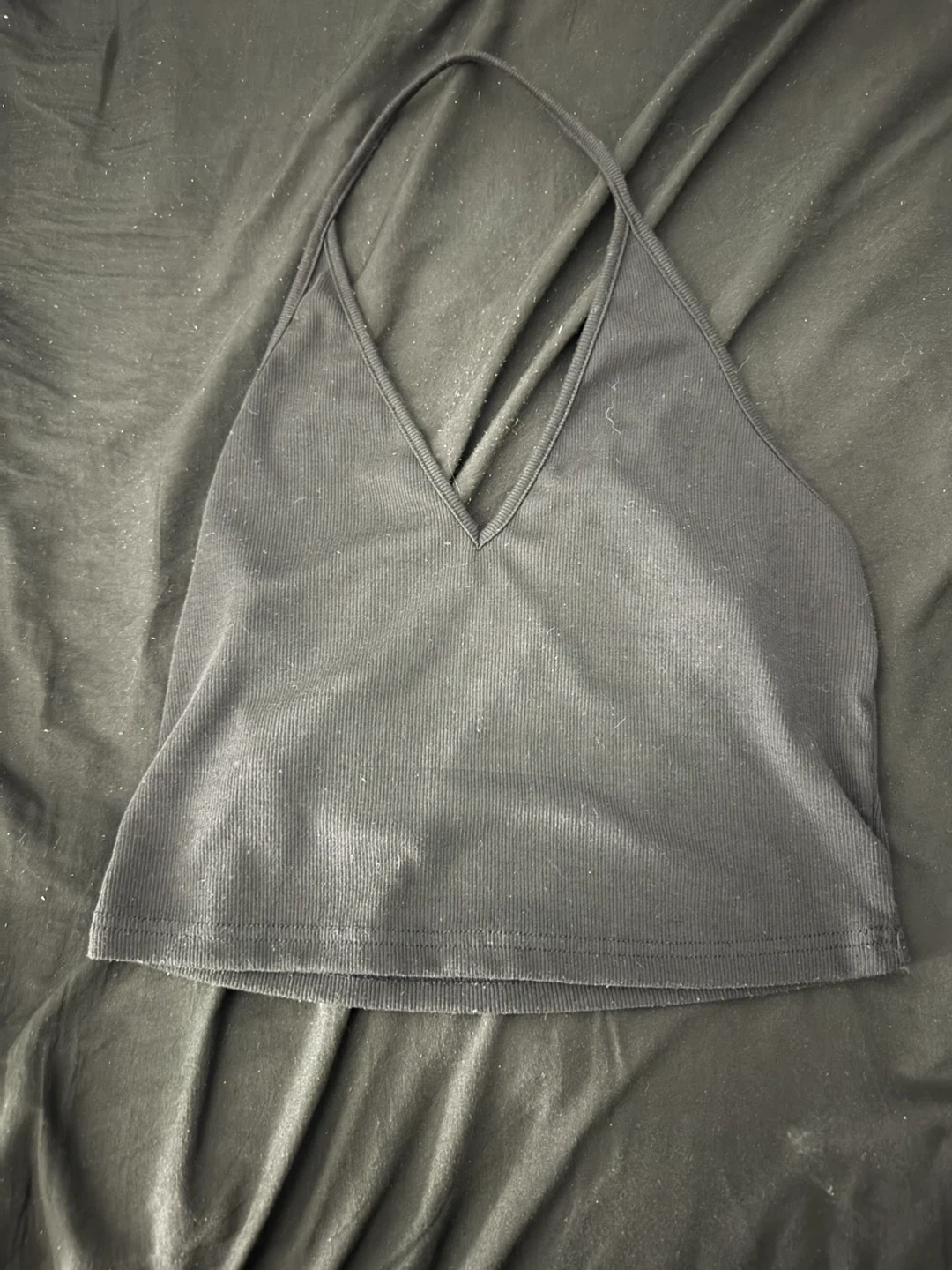 This is a black ribbed halter crop top. It's made of a stretchy material. Great for warmer weather!