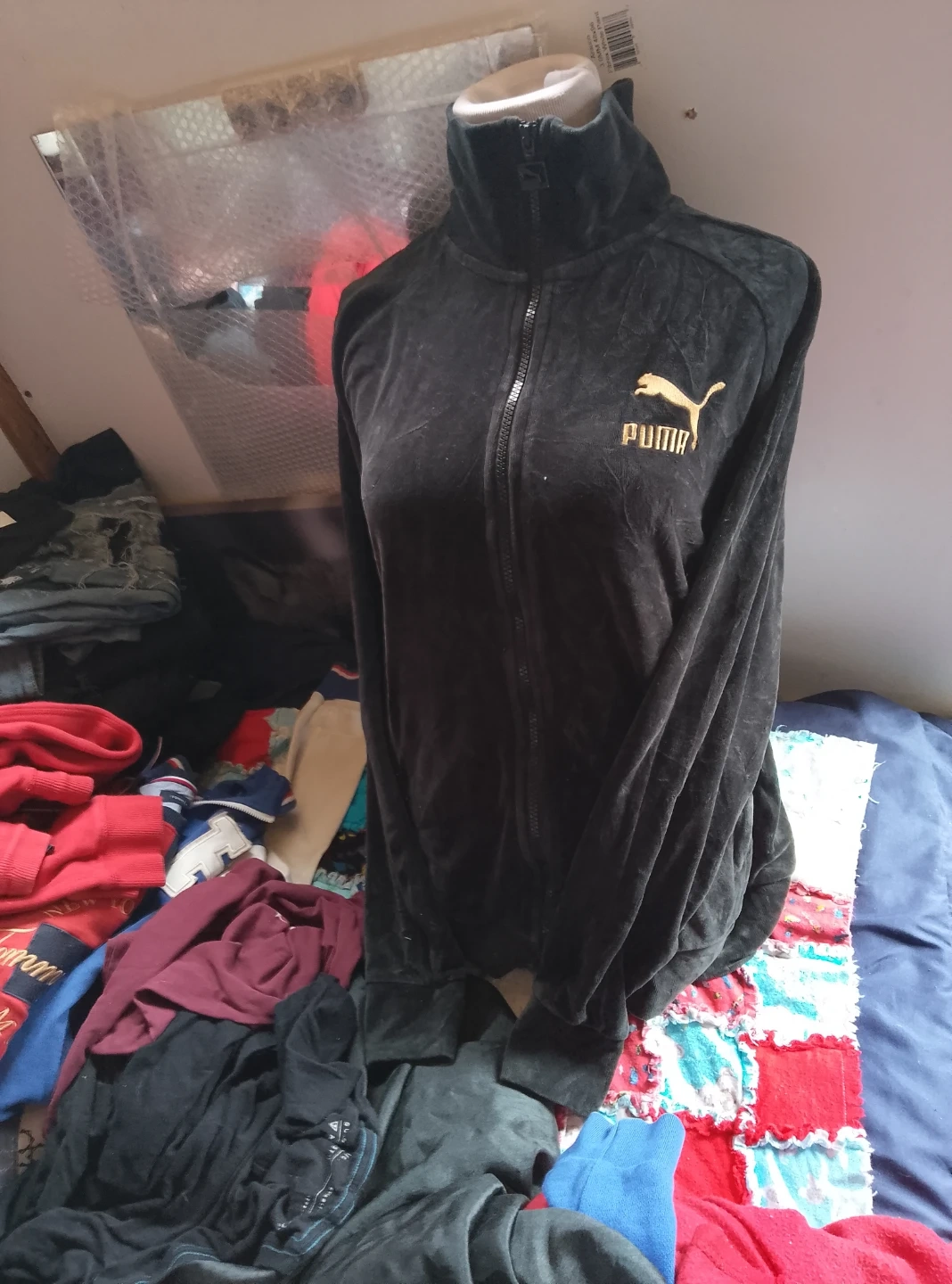 Black velour track jacket with gold Puma logo. Size medium in US, CA, and EU sizing. Made with quality.