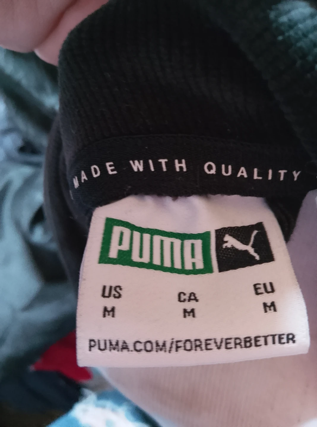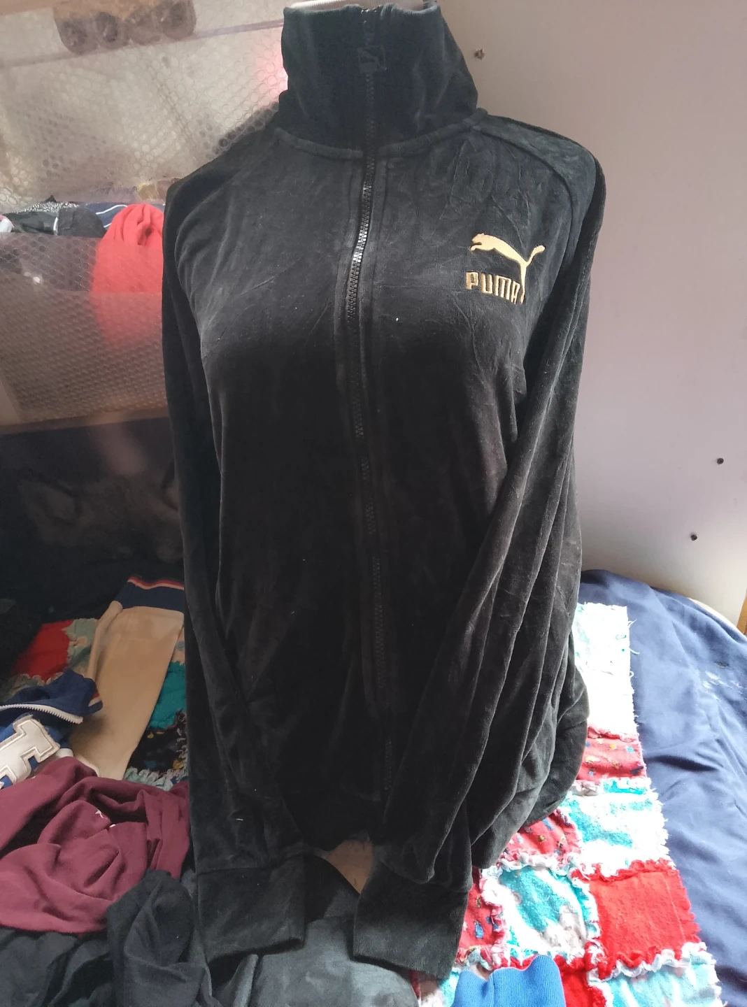 Black velour track jacket with gold Puma logo. Size medium in US, CA, and EU sizing. Made with quality.