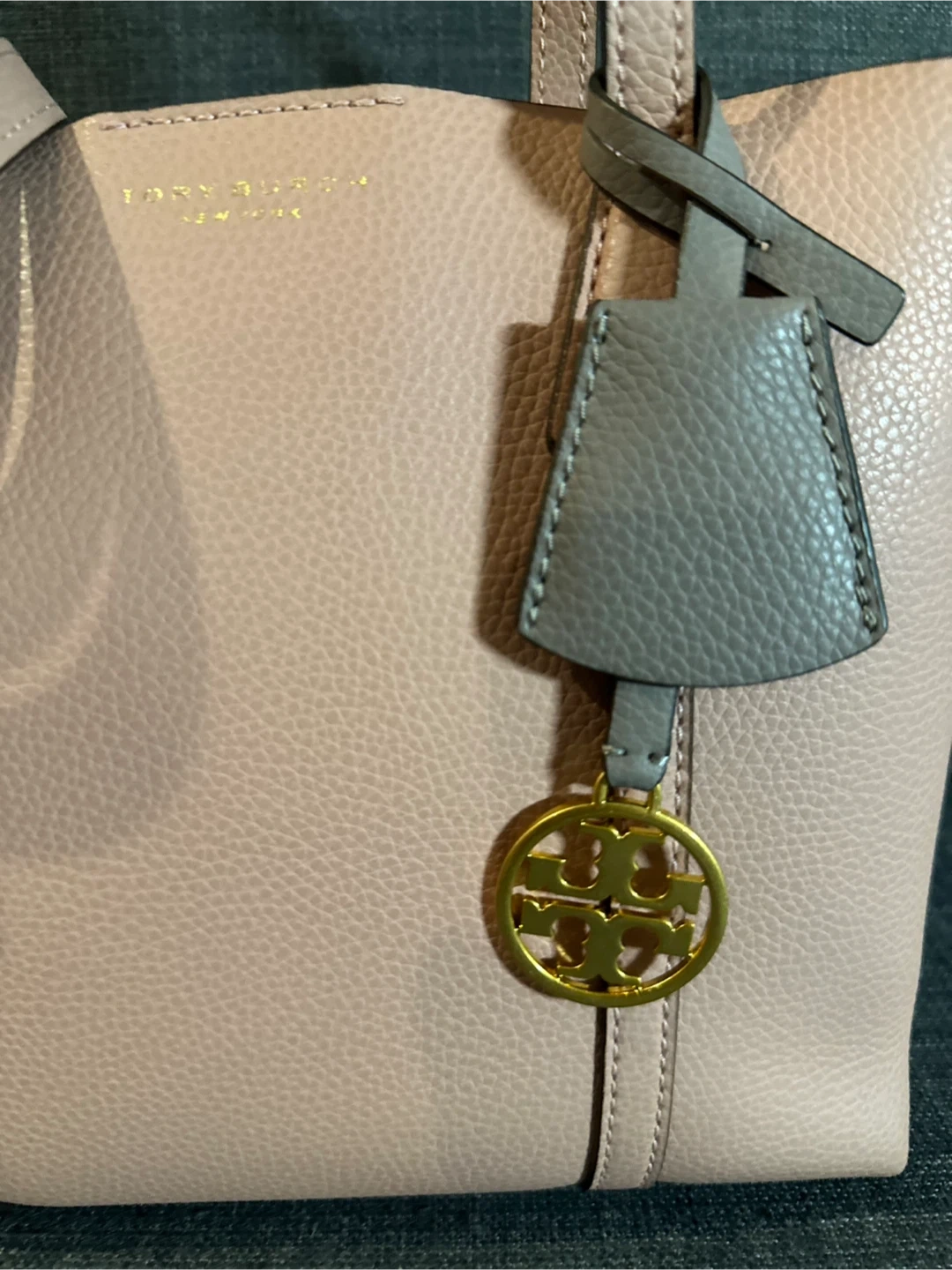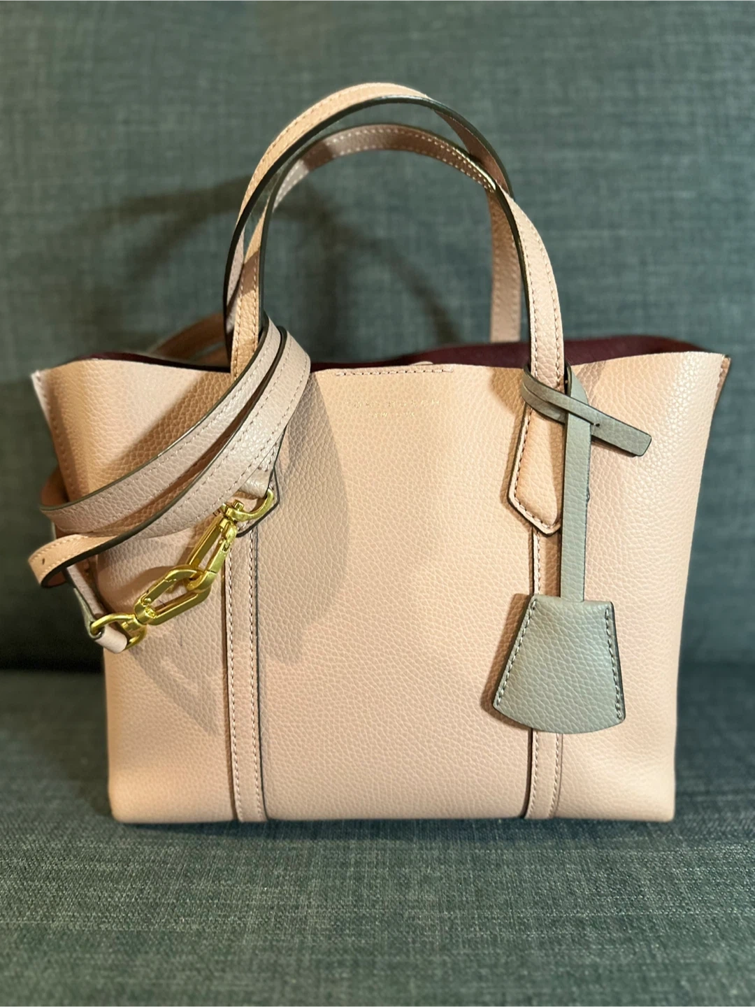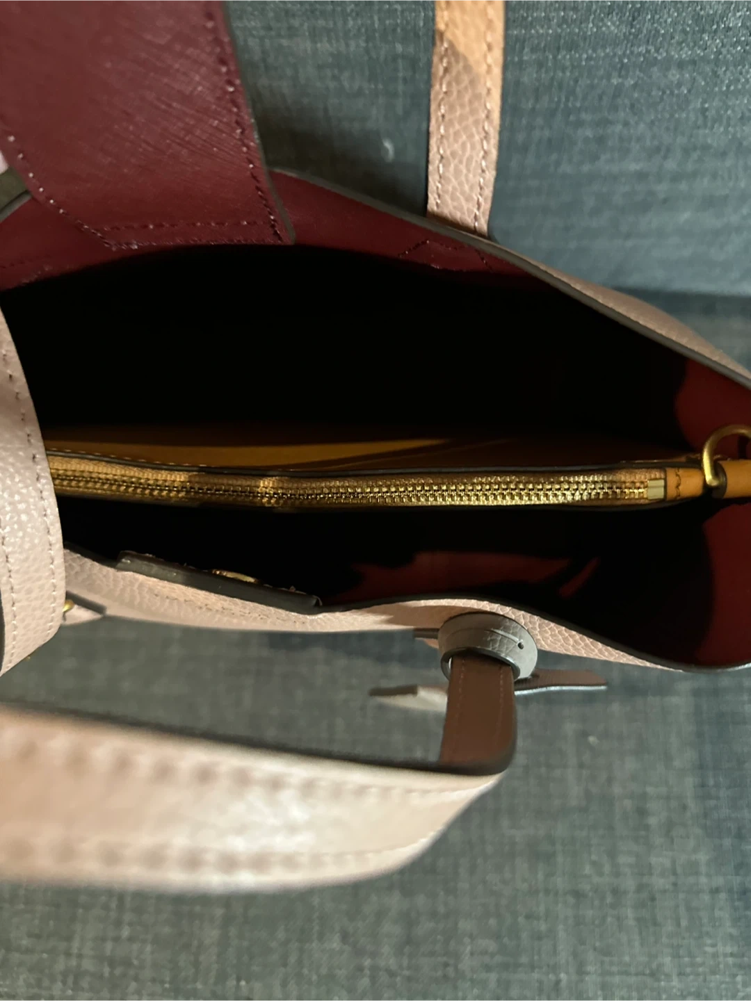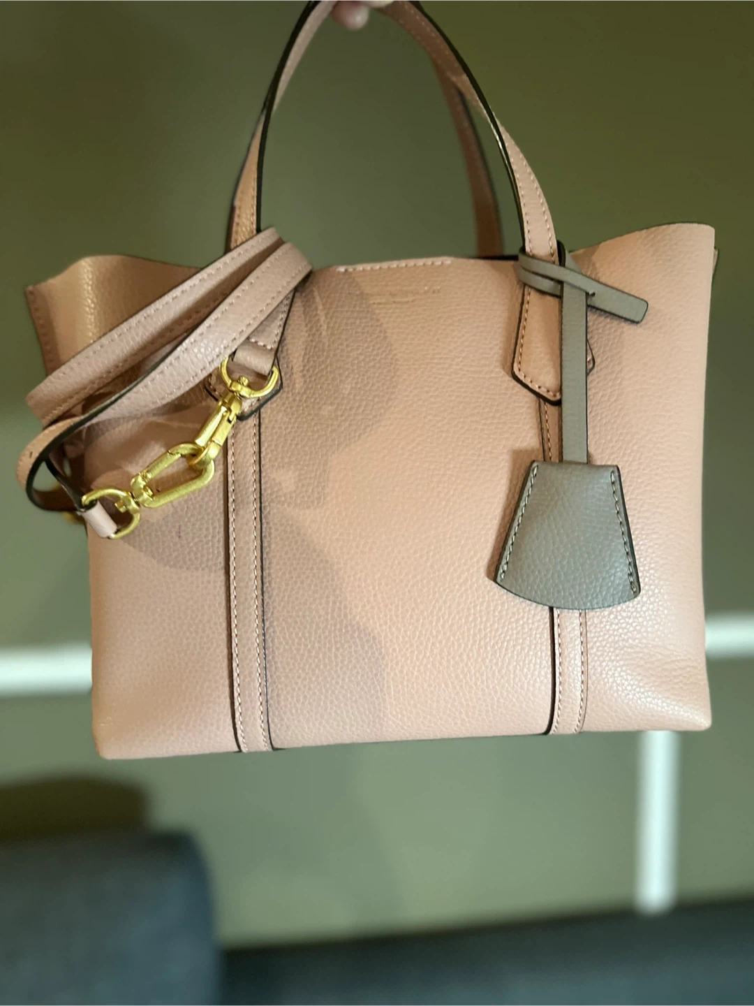 Tory Burch tote bag in a soft pink pebbled leather. It features a top zip closure and an optional crossbody strap. Interior has a zippered pocket.