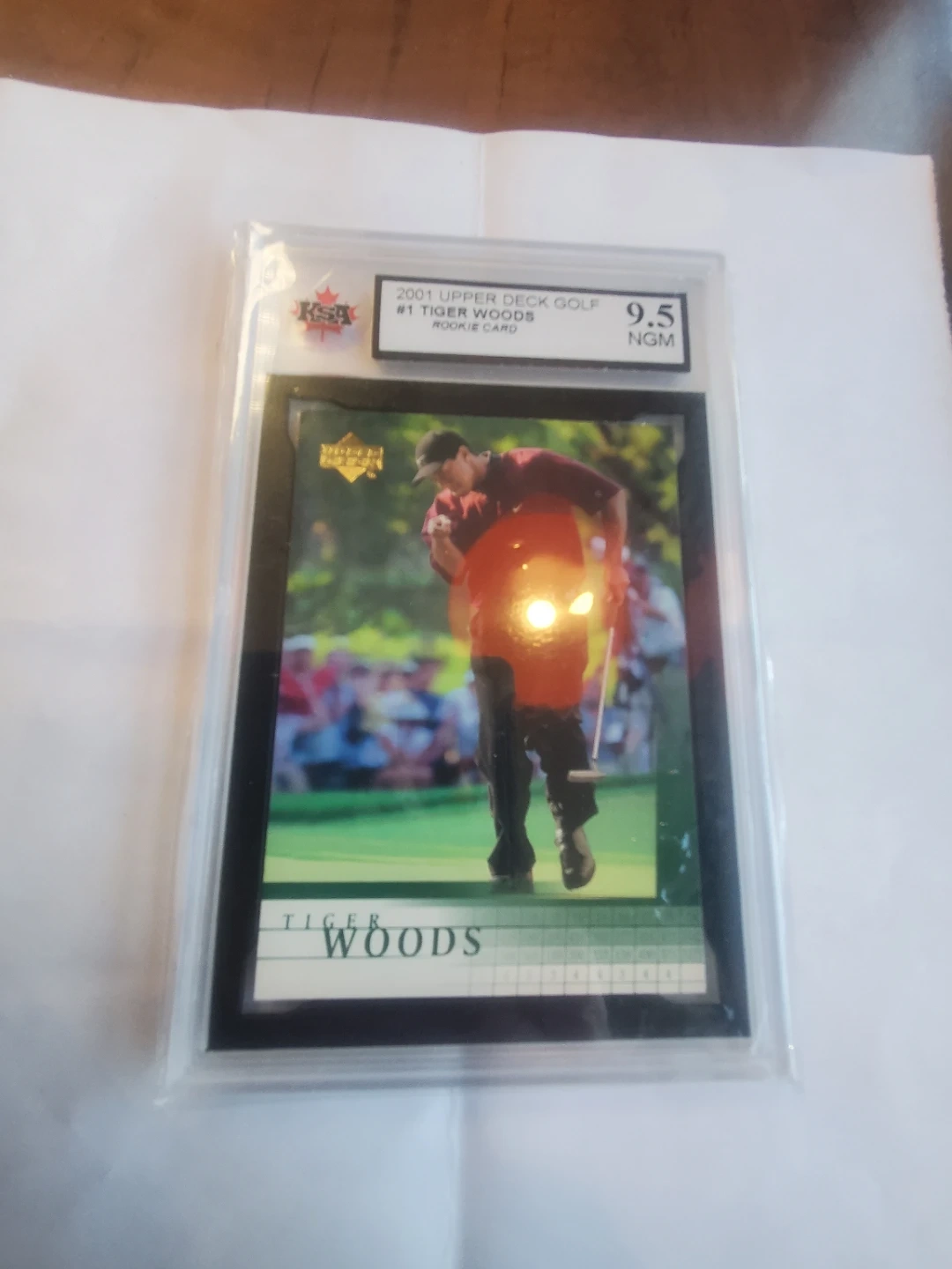 This is a 2001 Upper Deck Golf card featuring Tiger Woods. It's his rookie card, graded at 9.5 NGM. The card showcases Tiger Woods in action on the golf course.