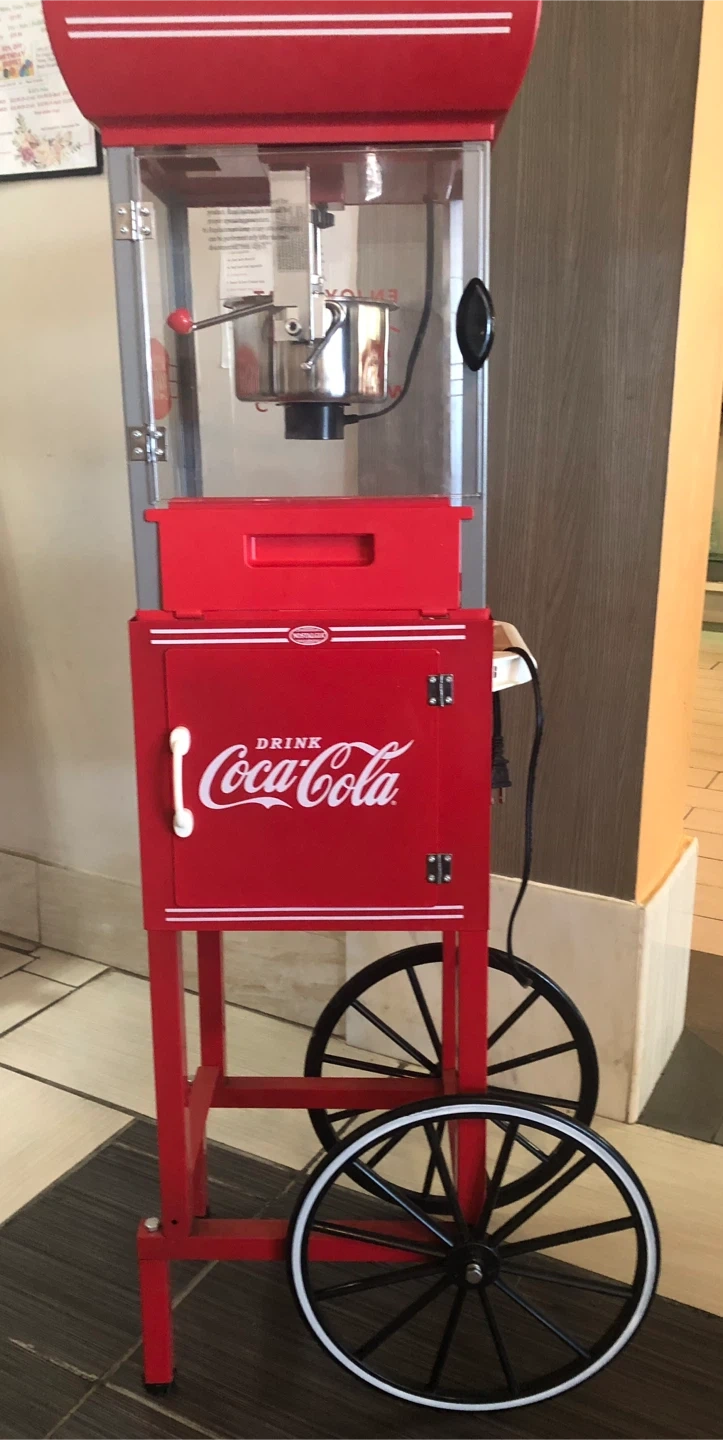 Brand new, never used. We bought it for decoration. Retro-style popcorn machine with a Coca-Cola theme and a handy cart. It's red and features classic Coke branding. Perfect for parties or home theatres! Pick up between Southdown Road & Truscott Drive in Mississauga ON.