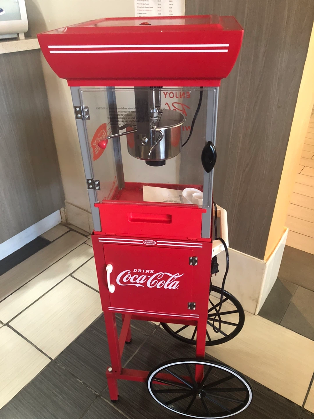 Brand new, never used. We bought it for decoration. Retro-style popcorn machine with a Coca-Cola theme and a handy cart. It's red and features classic Coke branding. Perfect for parties or home theatres! Pick up between Southdown Road & Truscott Drive in Mississauga ON.