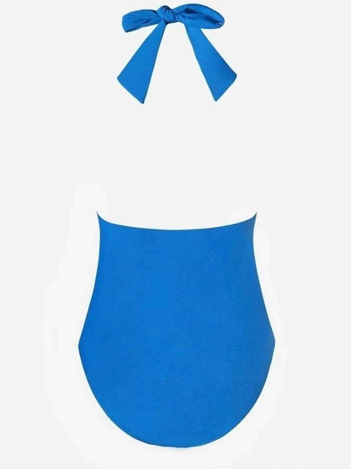 one piece swimsuit, bathing suit, halter swimsuit, ruched swimsuit, tummy control, swimwear, beachwear, pool, vacation, summer, blue swimsuit, women's swimsuit, full coverage, tie neck