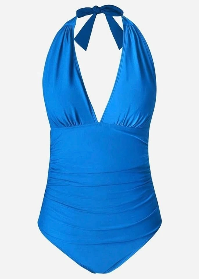 one piece swimsuit, bathing suit, halter swimsuit, ruched swimsuit, tummy control, swimwear, beachwear, pool, vacation, summer, blue swimsuit, women's swimsuit, full coverage, tie neck
