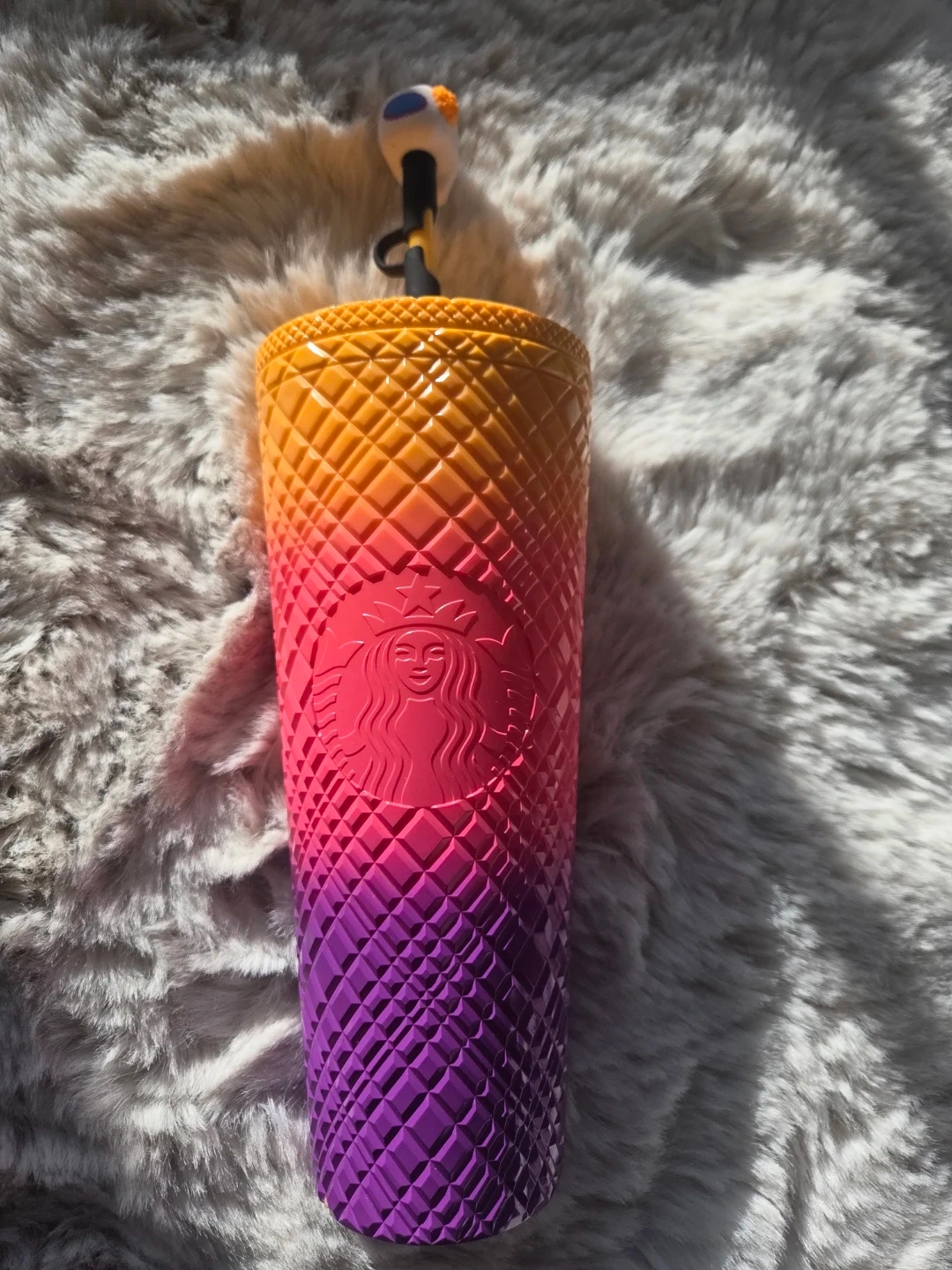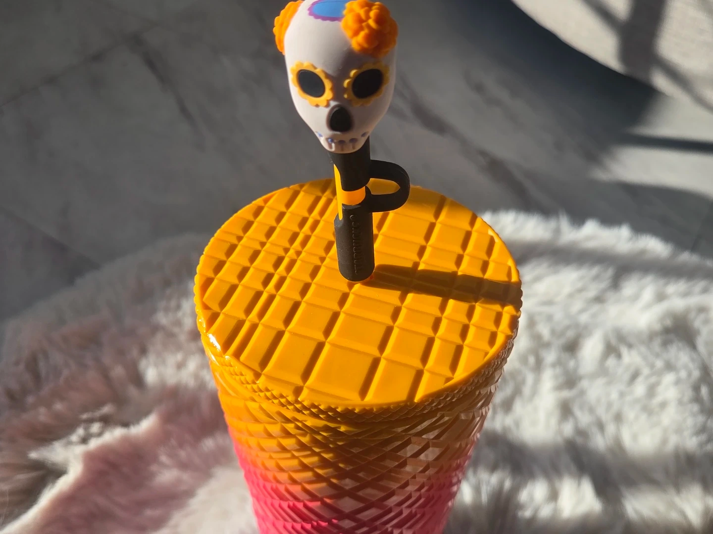 This Starbucks tumbler features a vibrant ombre design fading from yellow to pink to purple. It comes with a unique Day of the Dead skull-themed lid and straw topper. The textured diamond pattern adds a stylish touch to this reusable cup.