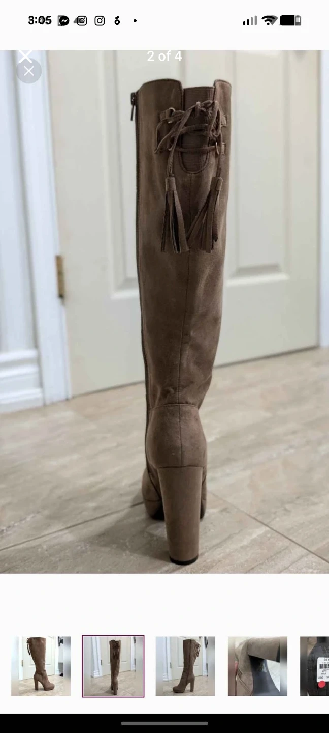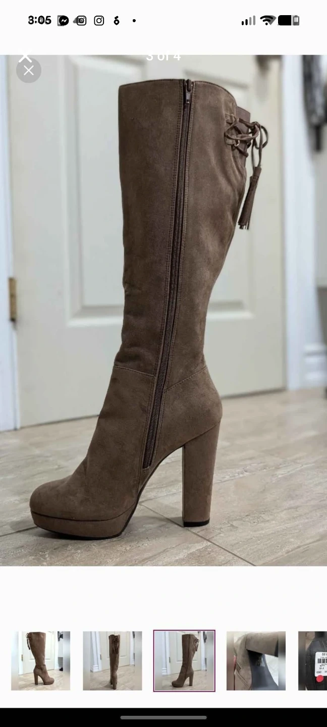 These taupe knee-high boots are crafted from faux suede material. They feature a side zipper and decorative lace-up detail with tassels at the back. The boots have a platform front and a block heel.