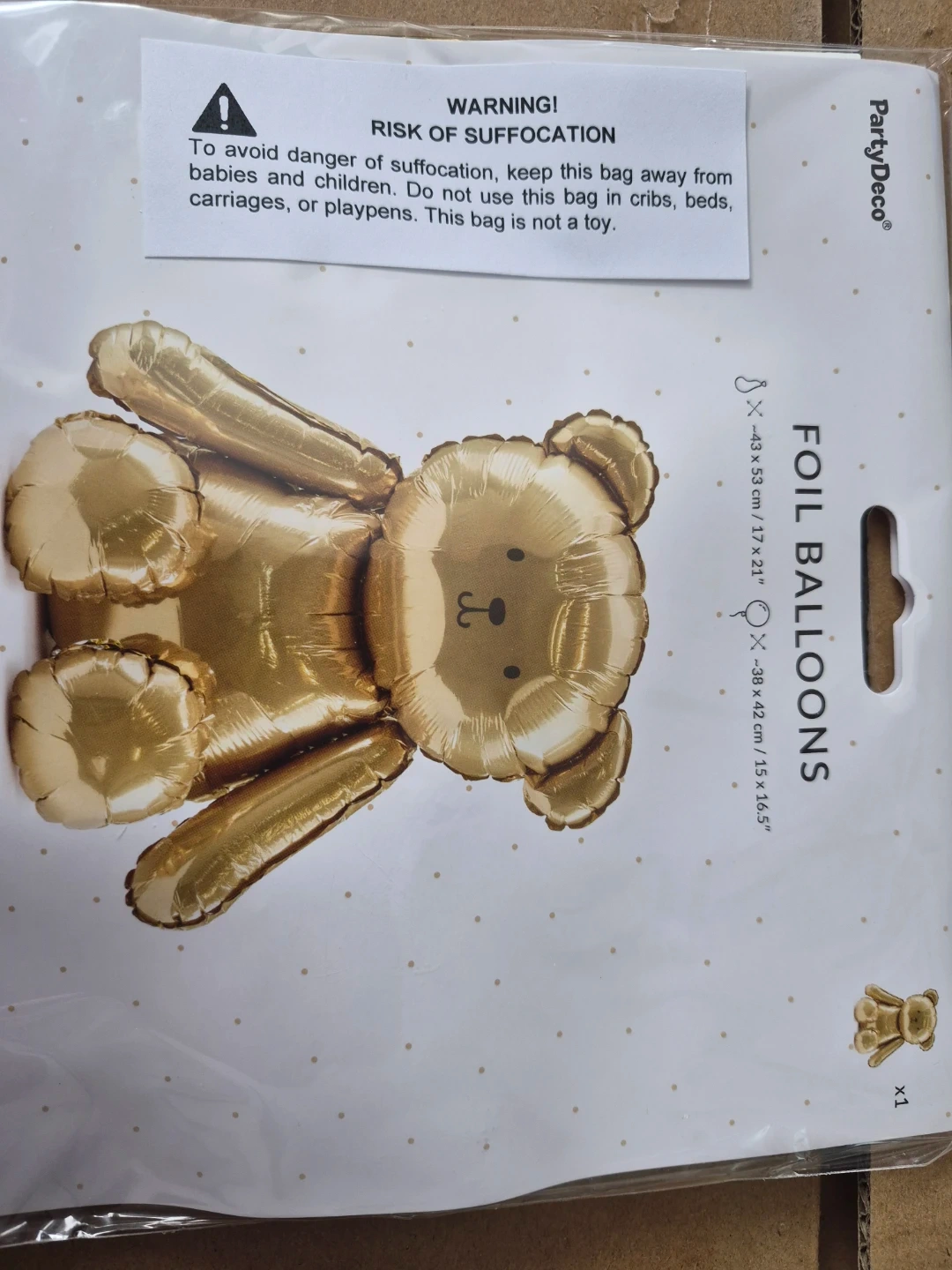 Gold foil balloon in a cute teddy bear shape. Uninflated. It measures approximately 43 x 53 cm / 17 x 21 inches when inflated. Perfect for birthdays or baby showers!