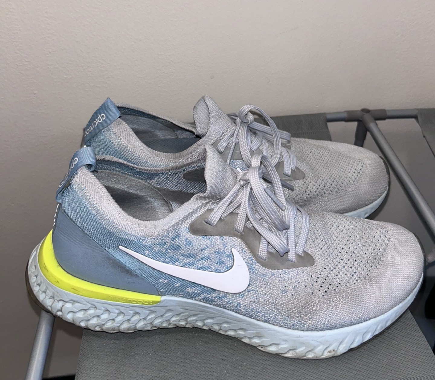 Size 9 Nike women’s running/ walking shoes in platinum blue colour. Extremely comfortable style. Used but in good condition.
