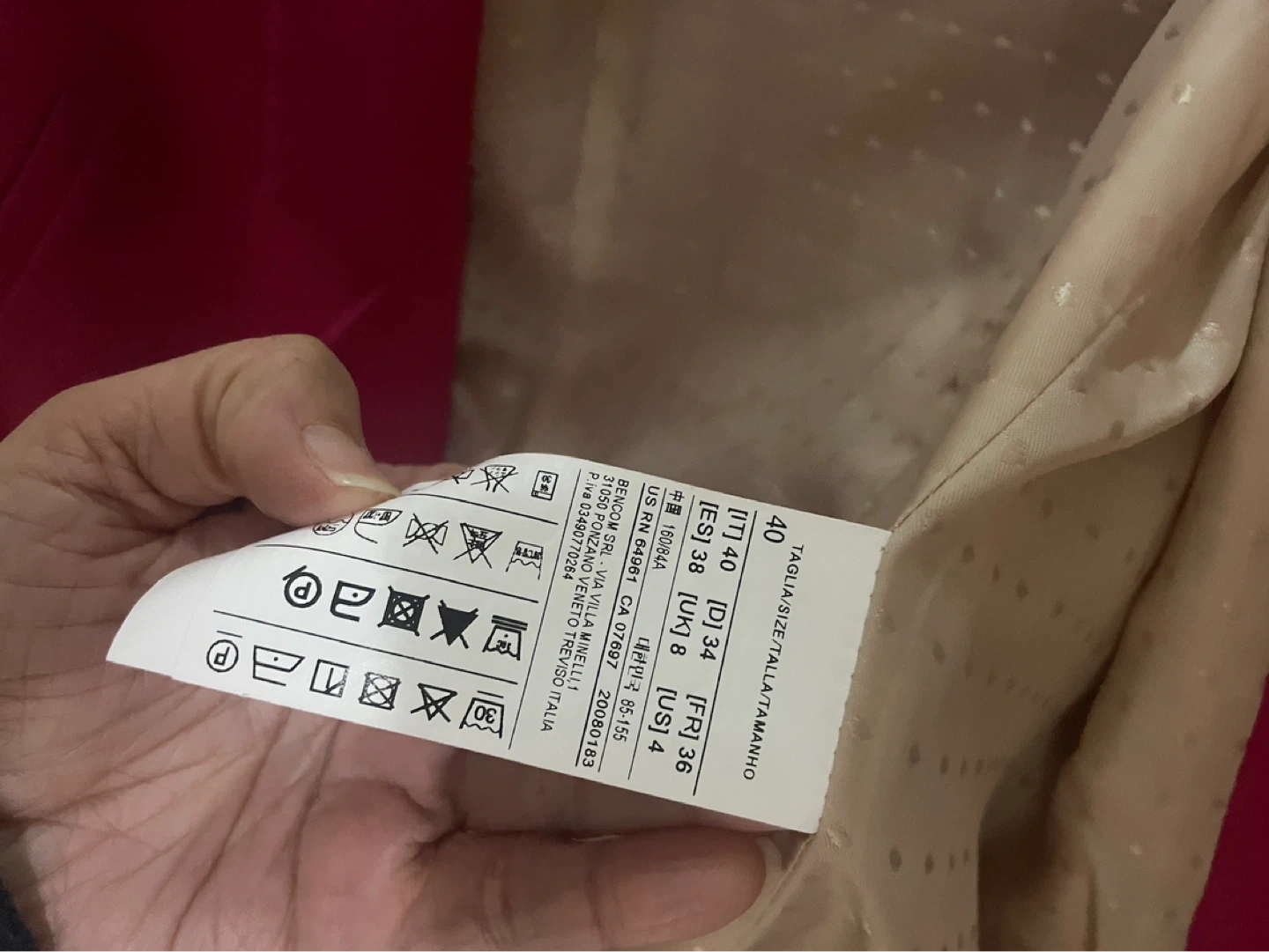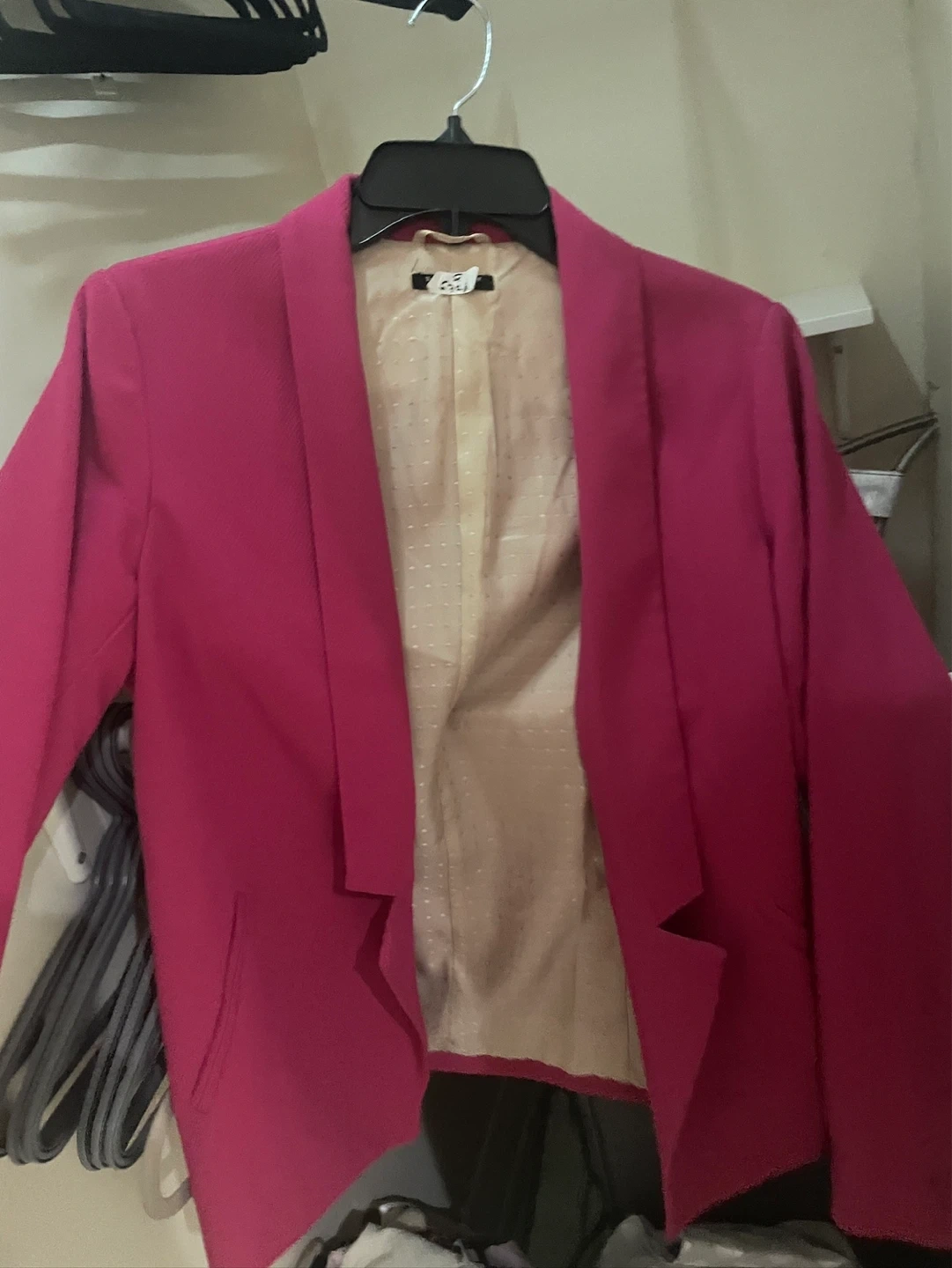 A stylish pink blazer. It's a size 4 in US sizing, equivalent to a size 40 in Italian sizing. The lining has a subtle dotted pattern.