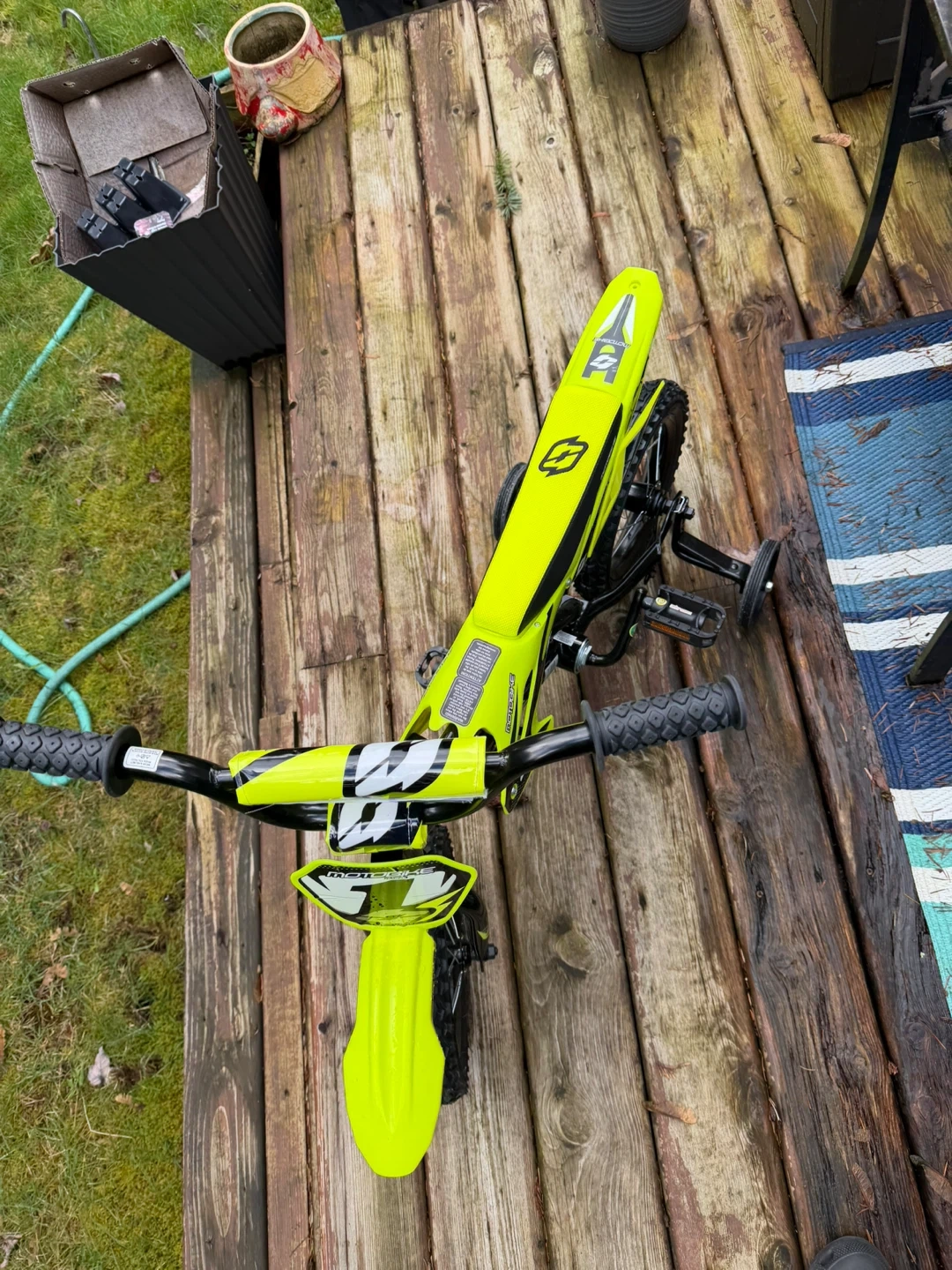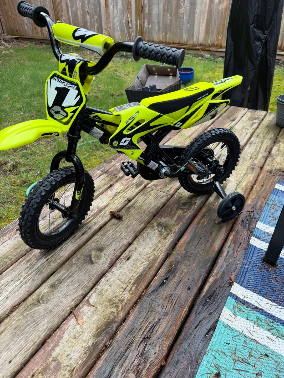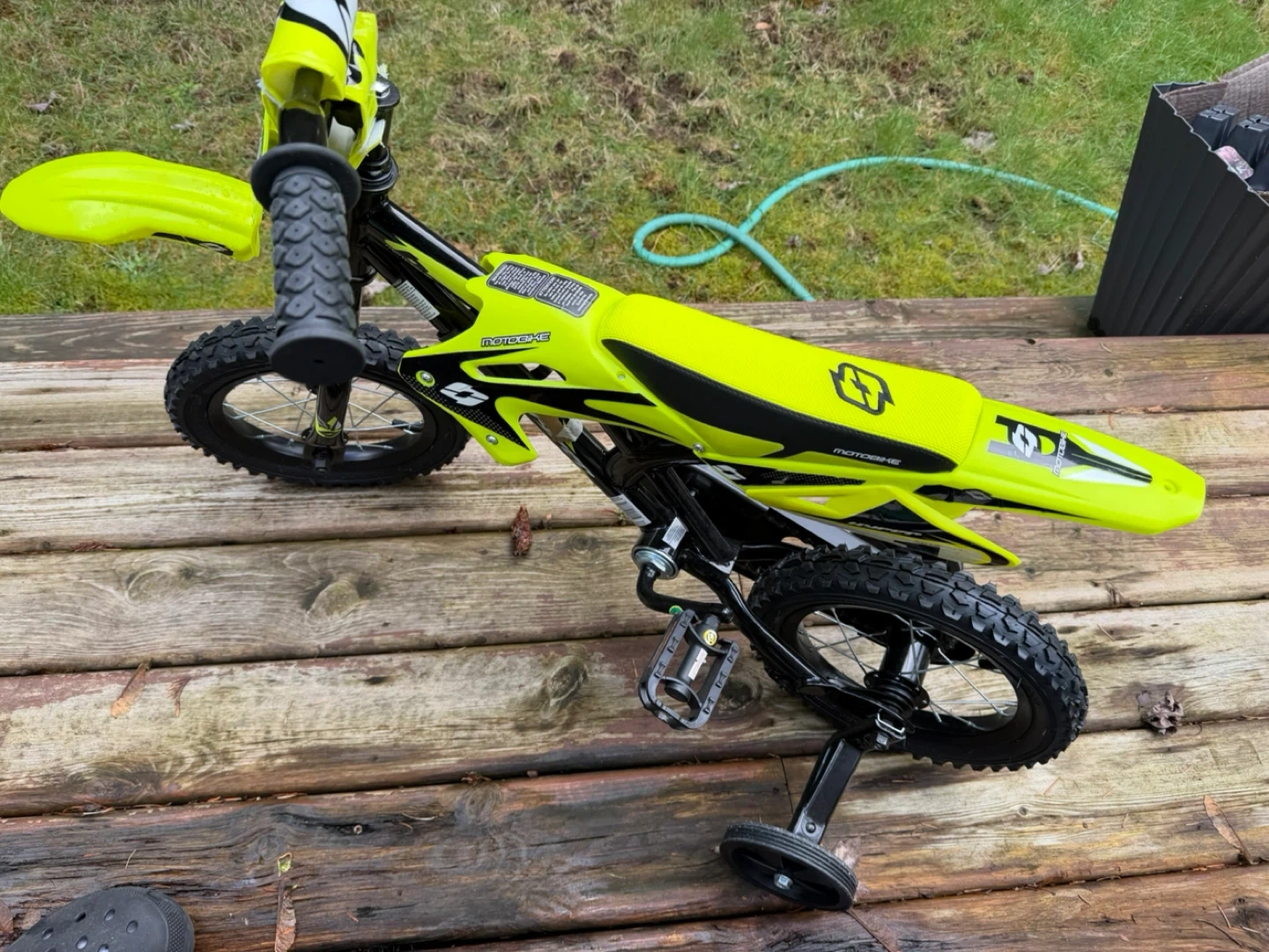 Kids bicycle suitable for begginers with a dirt bike feel. This kids' bicycle is designed to look like a cool "motobike" and comes in a bright, eye-catching yellow colour. It includes training wheels for beginners, making it super easy to learn to ride. Pedal bike with knobby tires for good grip. Great for young riders just starting out!