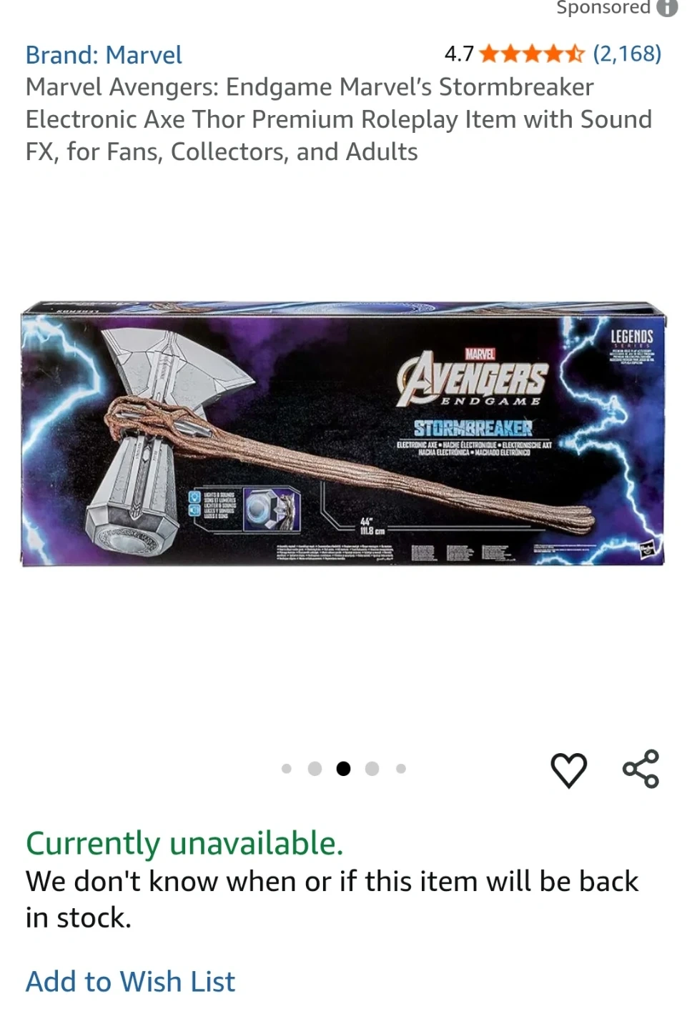 This is the Marvel Avengers Stormbreaker Electronic Axe by Hasbro. It's a premium roleplay item with sound effects. It's designed for fans and collectors. Dimensions are 38x7.75x15.25 inches. Brand new in brown shipper. Sealed, never opened.