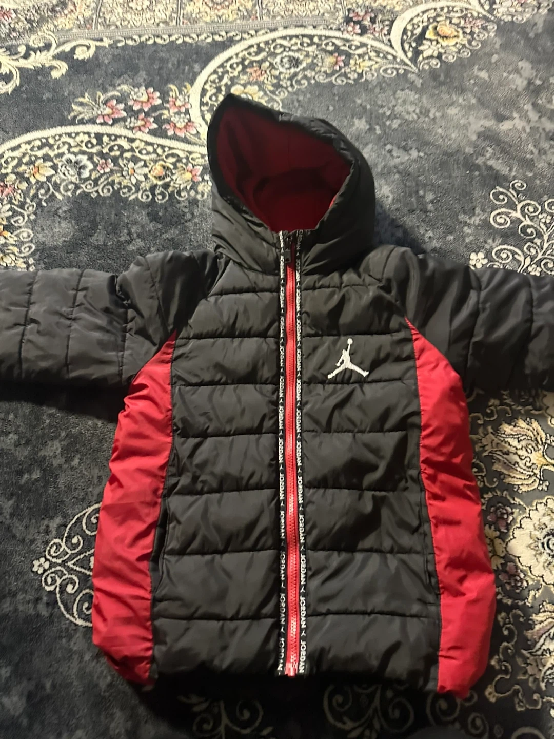This is a Jordan puffer jacket in black with red accents. It's a hooded winter coat designed for kids. Zipper closure and elastic cuffs.