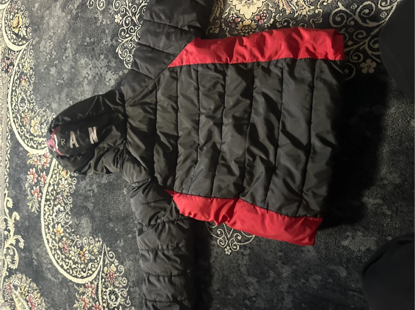 This is a Jordan puffer jacket in black with red accents. It's a hooded winter coat designed for kids. Zipper closure and elastic cuffs.