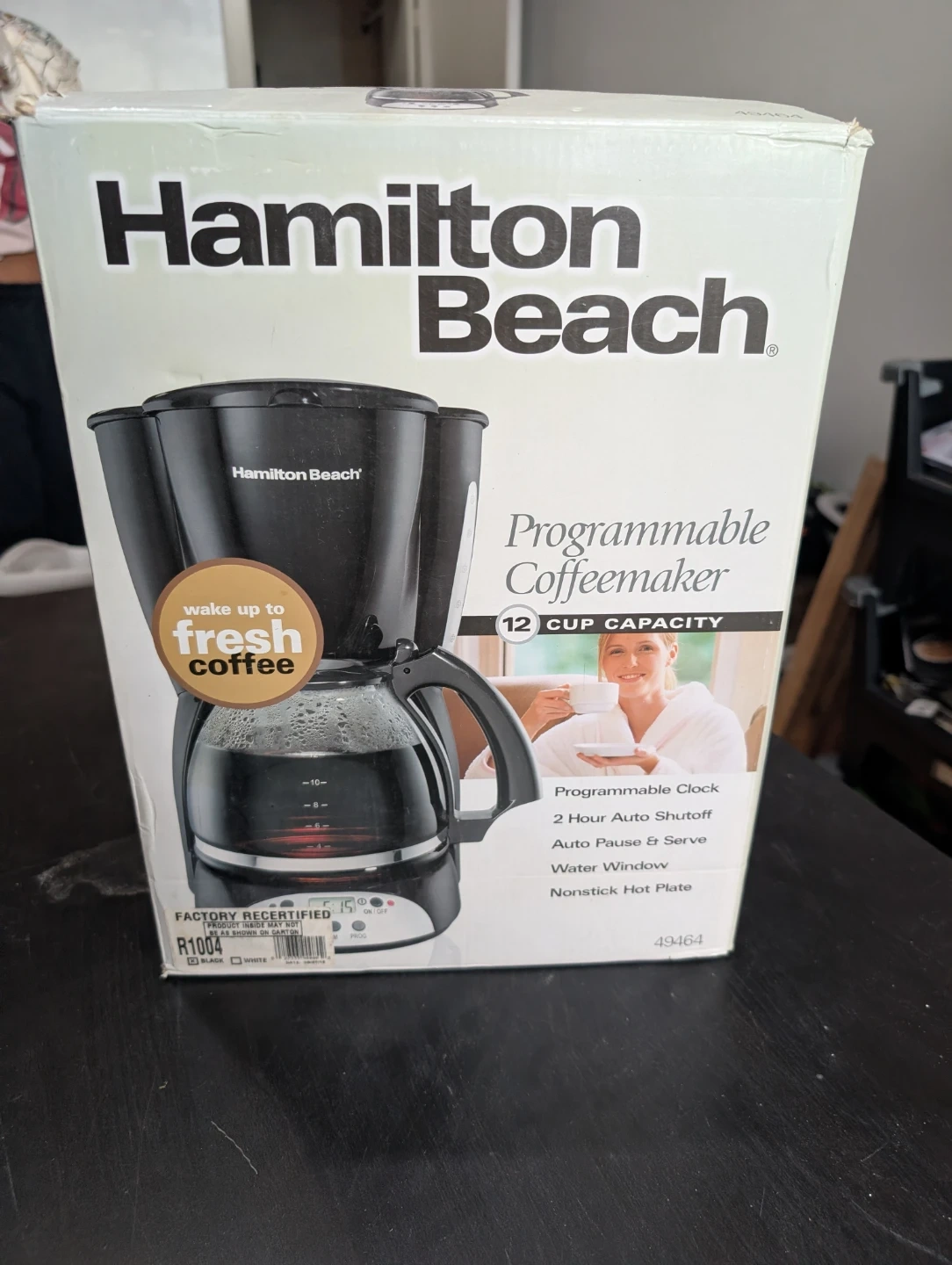 Selling a Hamilton Beach programmable coffeemaker that can brew up to 12 cups. It comes with the original box. It also features a programmable clock, 2-hour auto shutoff, auto-pause & serve, and a nonstick hot plate.