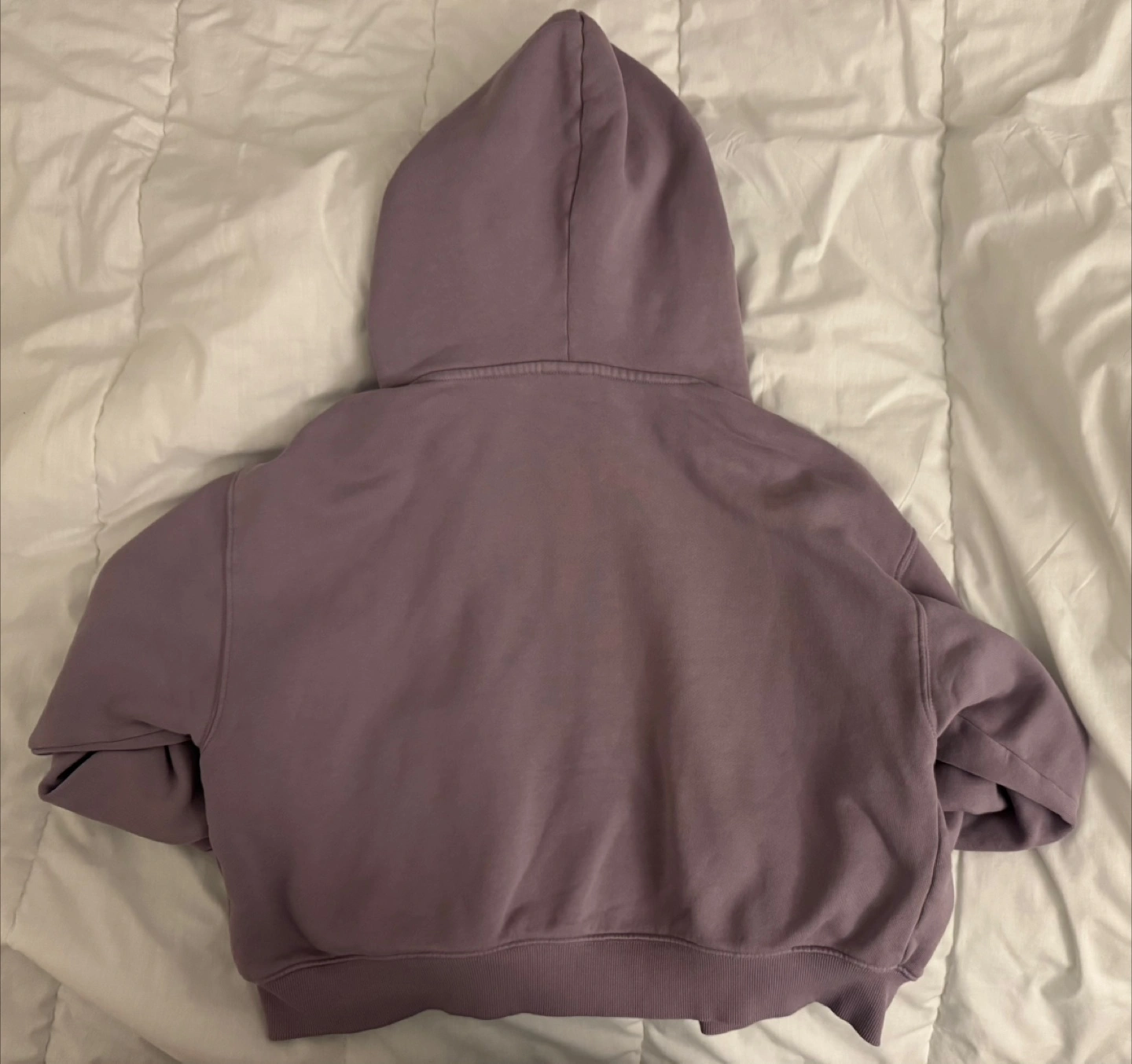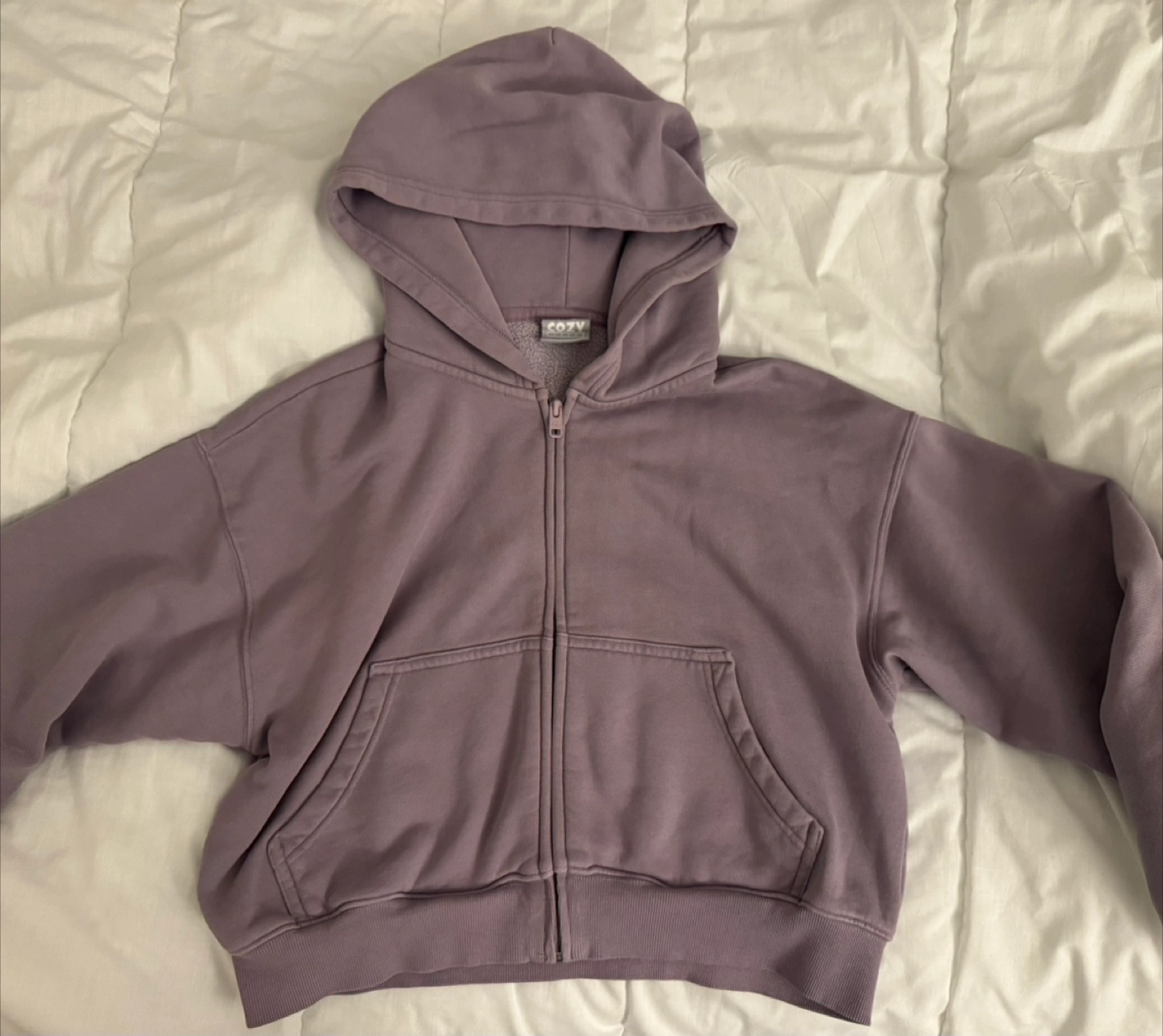In perfect like new condition. Super cute, comfy and soft lilac coloured zip up from Aritzia. Fits oversized (good for small and medium). Never really wore it, just been sitting in my closet. This is one of the older styles so it’s better quality! This is the waist-length one and not the full zip.