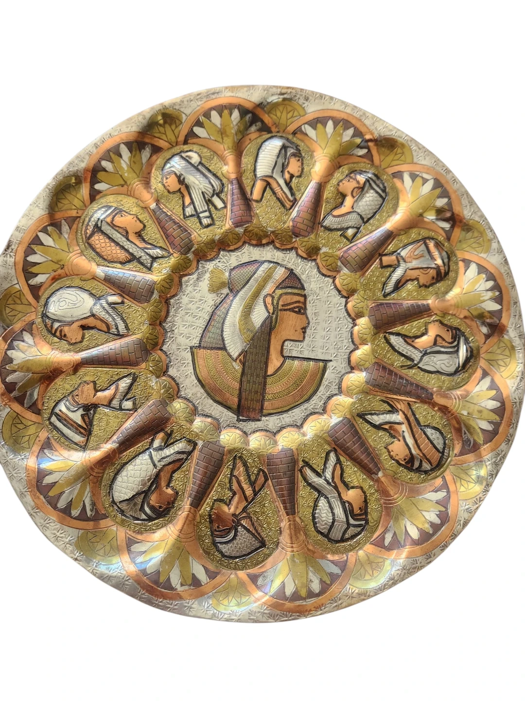 This decorative plate showcases a detailed relief of Egyptian figures and headdresses. It features a central portrait surrounded by a circular pattern of pharaohs and hieroglyph-like designs. The metalwork combines copper, gold, and silver tones for a striking visual effect.