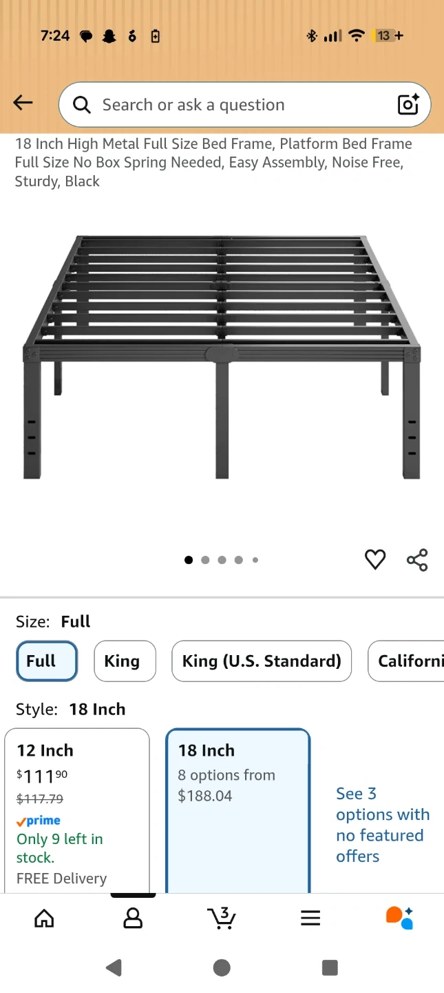 18" High metal bed frame. Platform style. No box spring needed. Easy assembly.