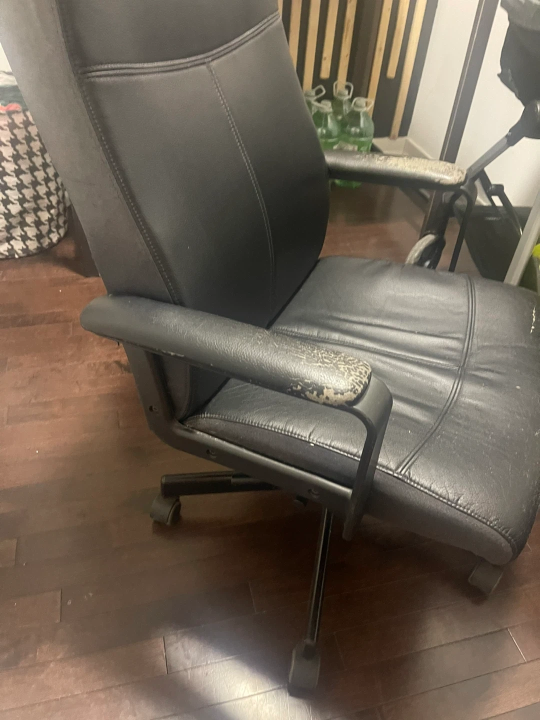 Selling a black office chair that's seen better days. As you can see in the pictures, the armrests have some wear and tear, and there are some scuffs on the seat. Still functions as it should, though!