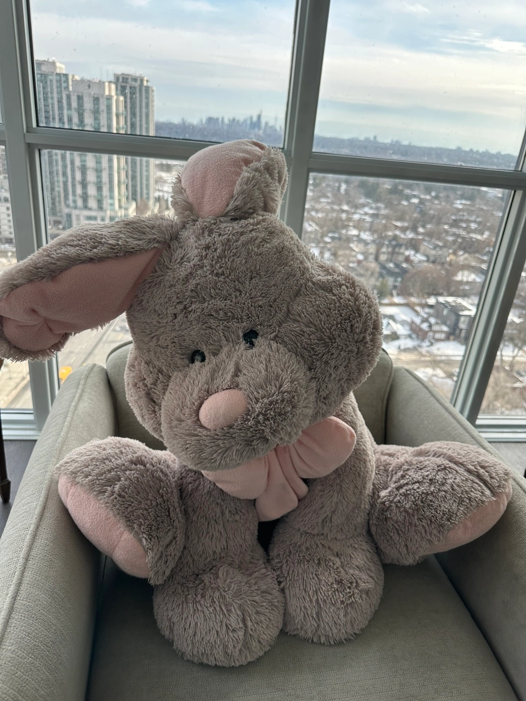 Huge grey plush bunny. Soft and cuddly. Perfect for cuddling or decorating. Pink inner ears and bow.