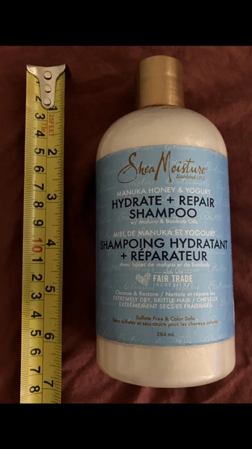 Up for trades is a bottle of Shea Moisture Manuka Honey & Yogurt Hydrate + Repair Shampoo. It's a sulfate-free and colour-safe formula, perfect for cleansing, moisturizing, and restoring your hair.