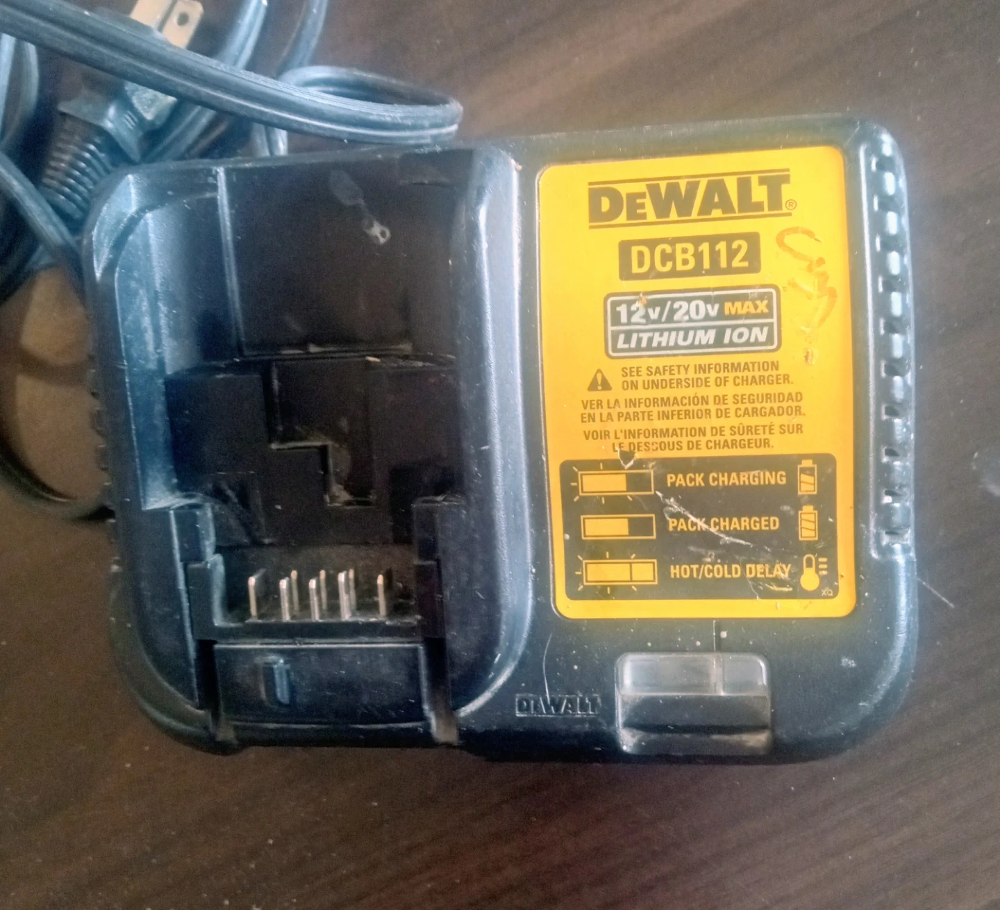This is a DeWalt DCB112 battery charger. It's designed for 12V and 20V MAX Lithium Ion batteries. Features pack charging, pack charged, and hot/cold delay indicators.