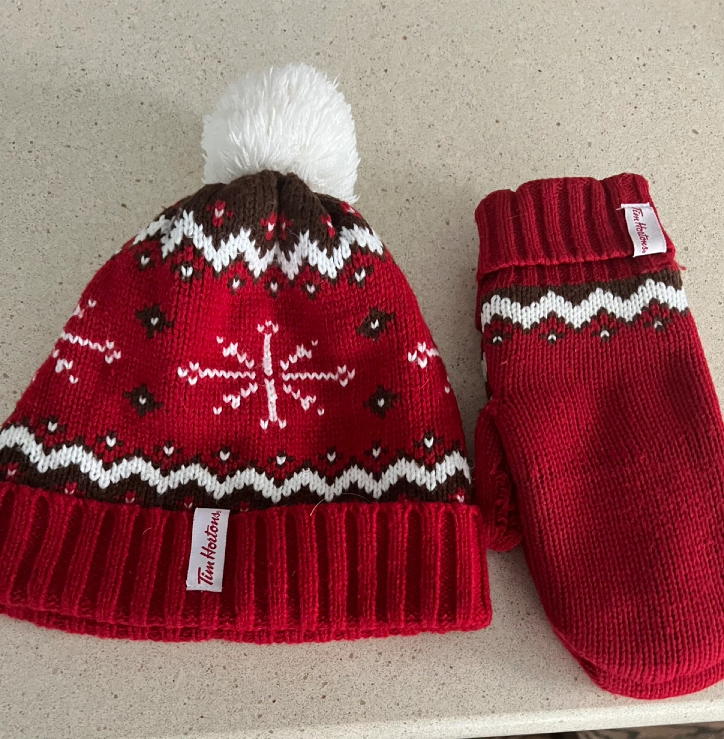 Stay cozy with this festive Tim Hortons knit set. It features a red hat with a snowflake pattern and a matching pair of mittens. Perfect for keeping warm on chilly days!