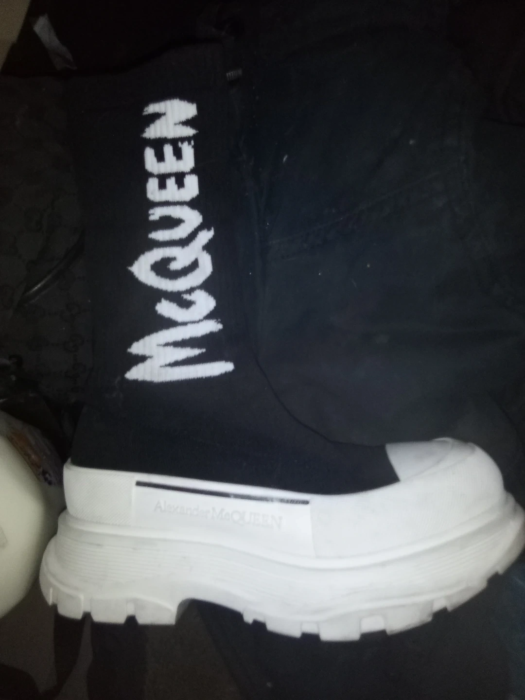 Black and white Alexander McQueen sock boots with a chunky sole. These boots have the McQueen logo printed on the shaft.
