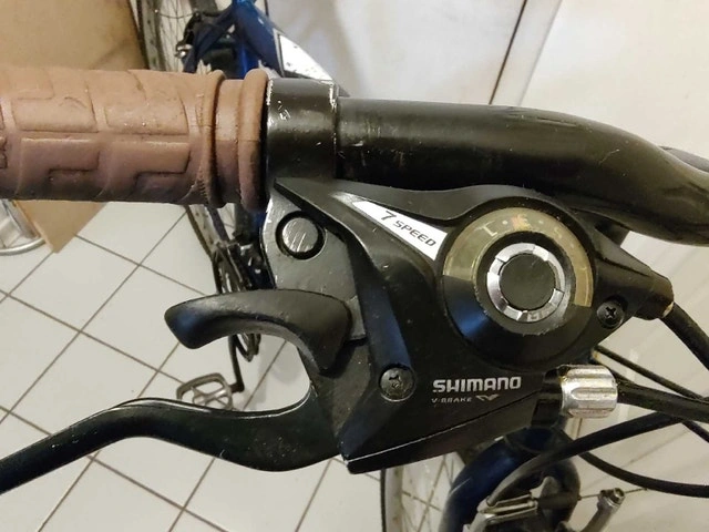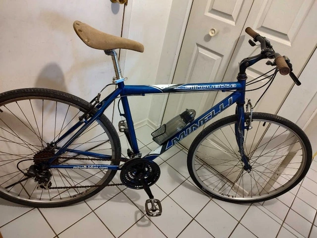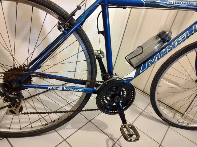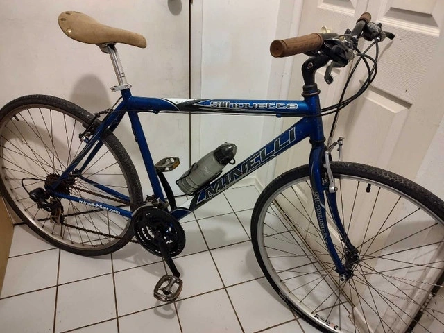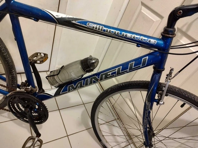 This Minelli Silhouette bicycle has a 20" (50 cm) frame, suitable for riders 5'5" - 6'0". It features a quick-release front wheel and seatpost. The bike is equipped with Shimano Tourney 21-speed derailleurs and Shimano Rapid Fire shifters integrated with the brake levers. It has 700c Alexrims with hybrid tires and a comfortable seat. Includes a bonus bottle holder and red light. The frame has some minor scratches and chipped paint, but overall, the bike is in good condition and ready to ride.