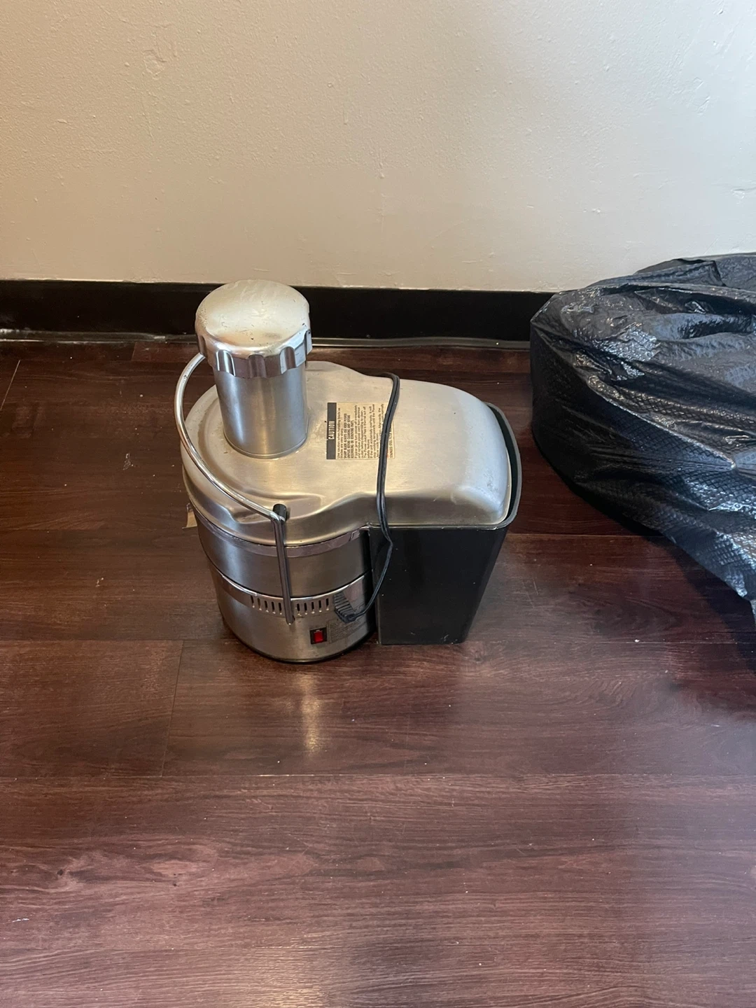 This is a stainless steel juicer. It has a wide chute for easy feeding. The pulp bin is integrated. Works just as good as a new one.