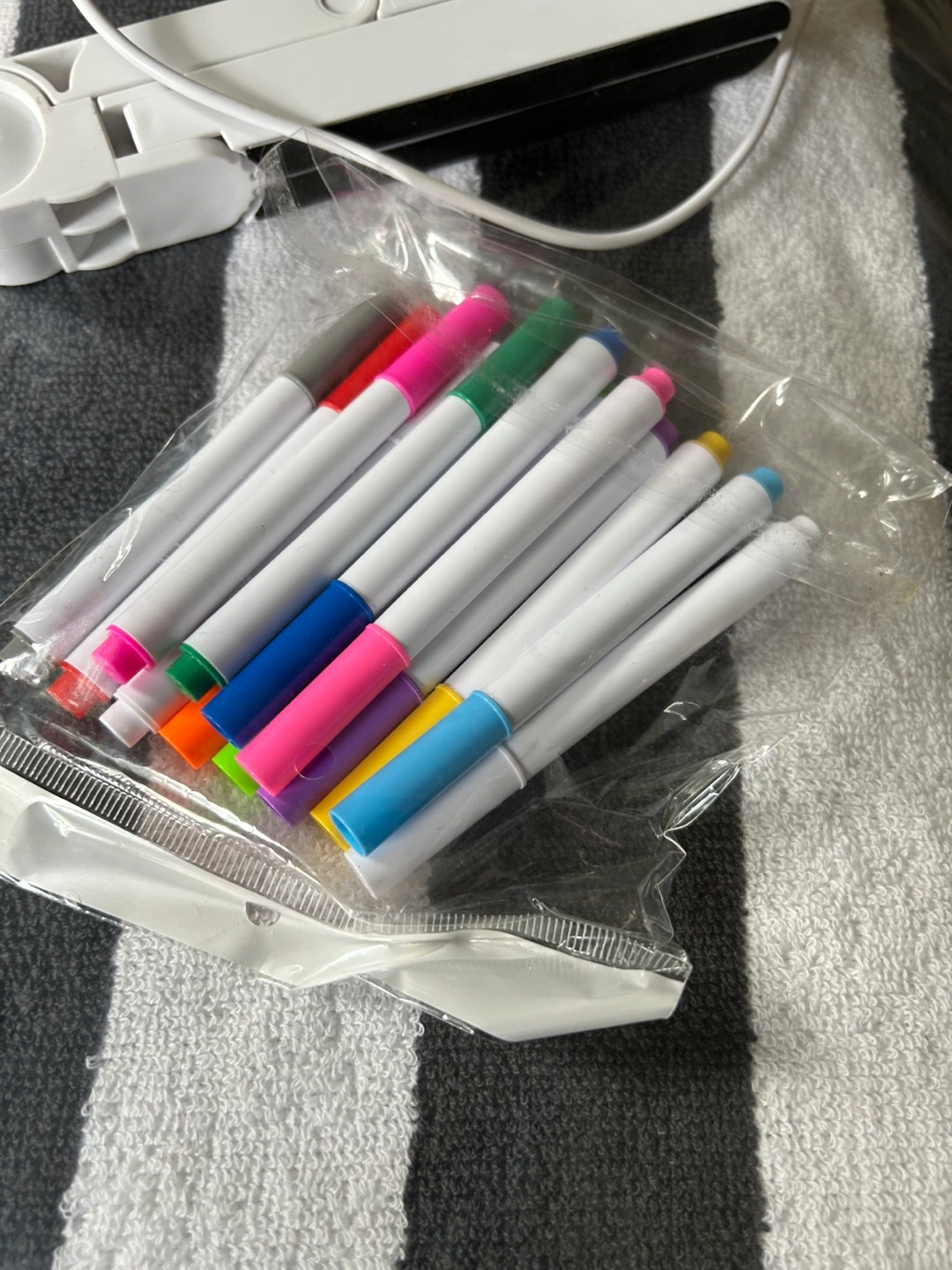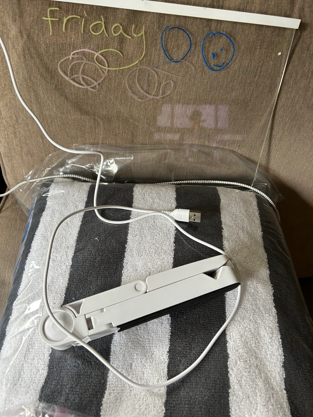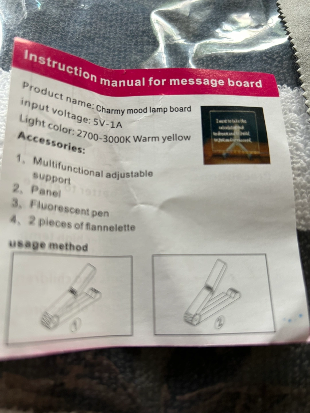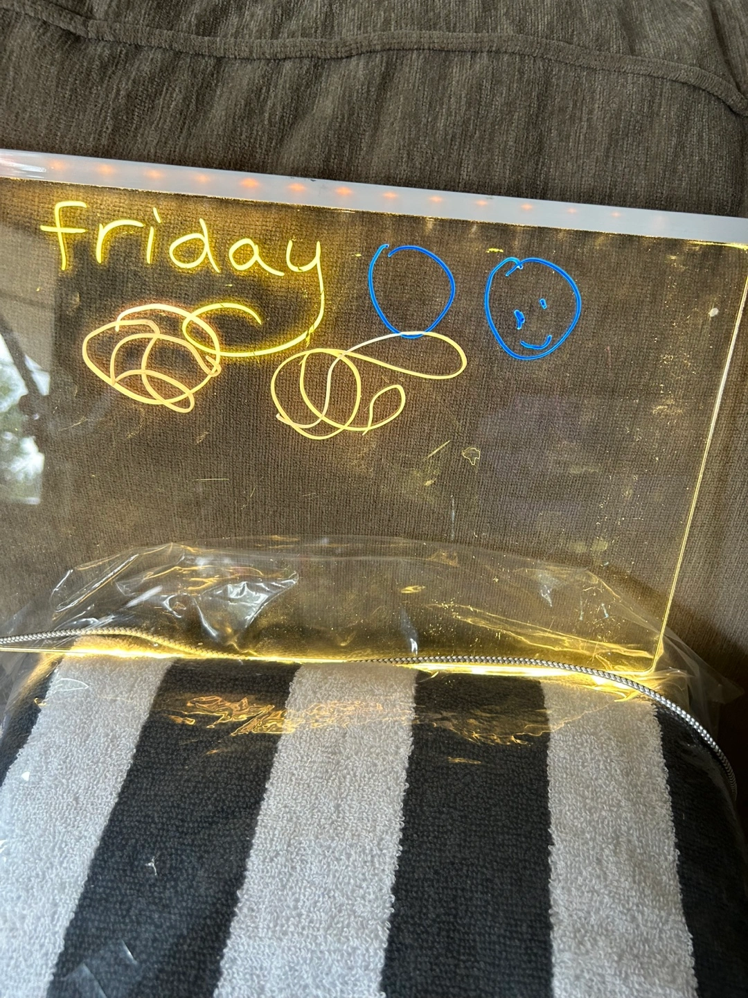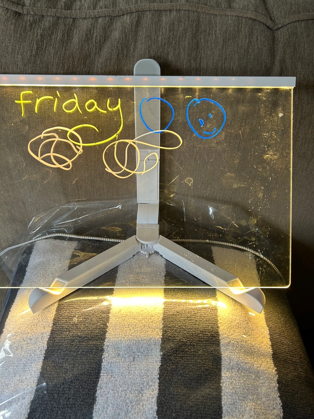 This is a fun LED message writing board! It comes with a stand and is perfect for leaving notes or drawing little pictures. It looks like it's in great condition and ready for a new home