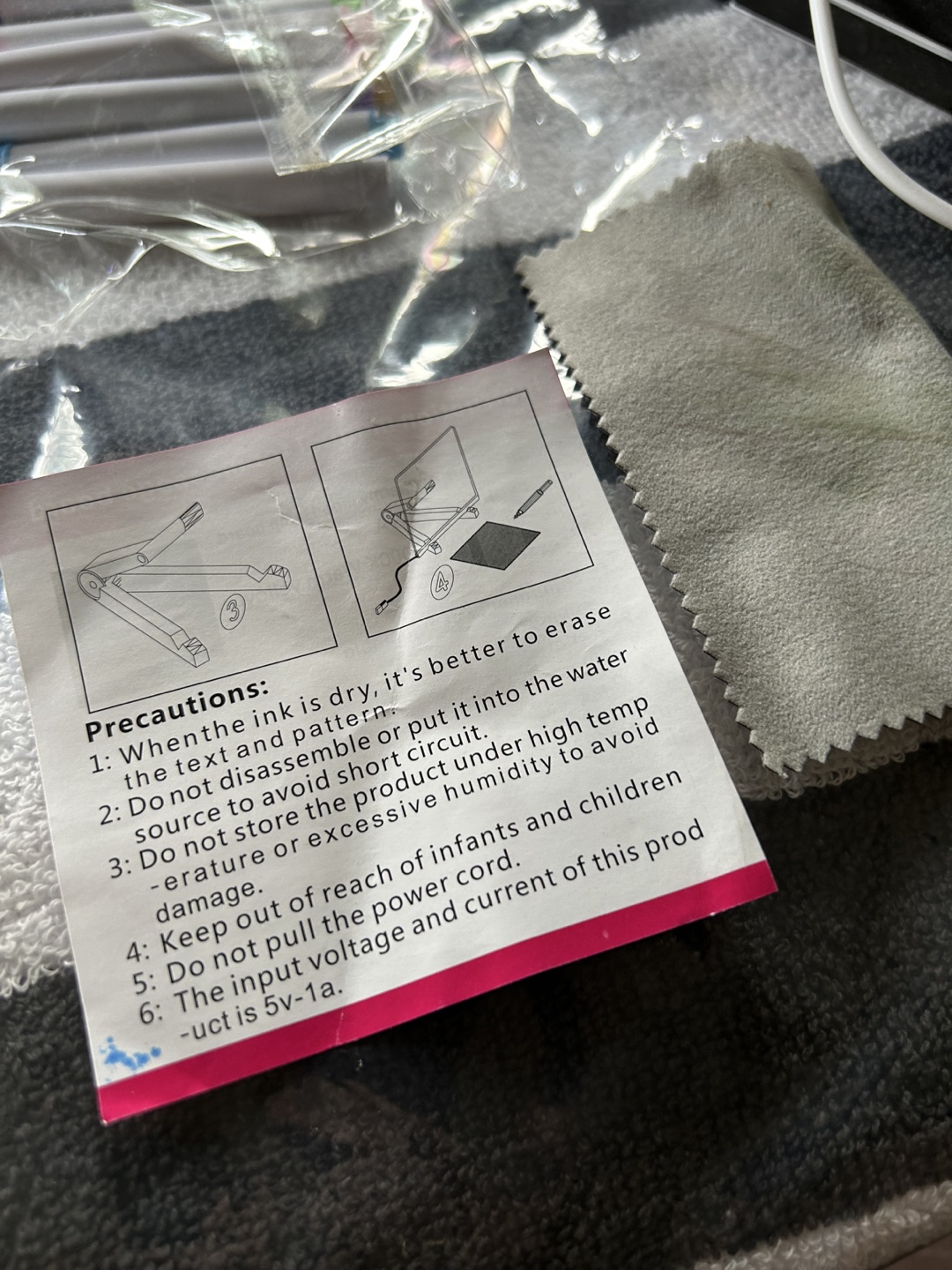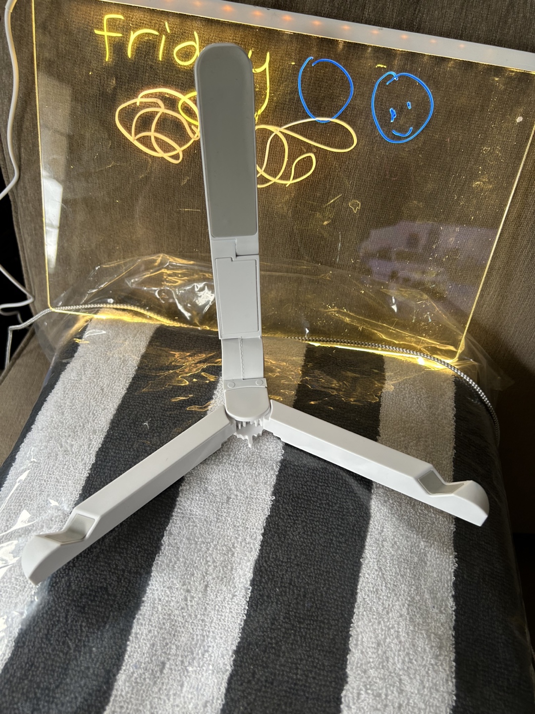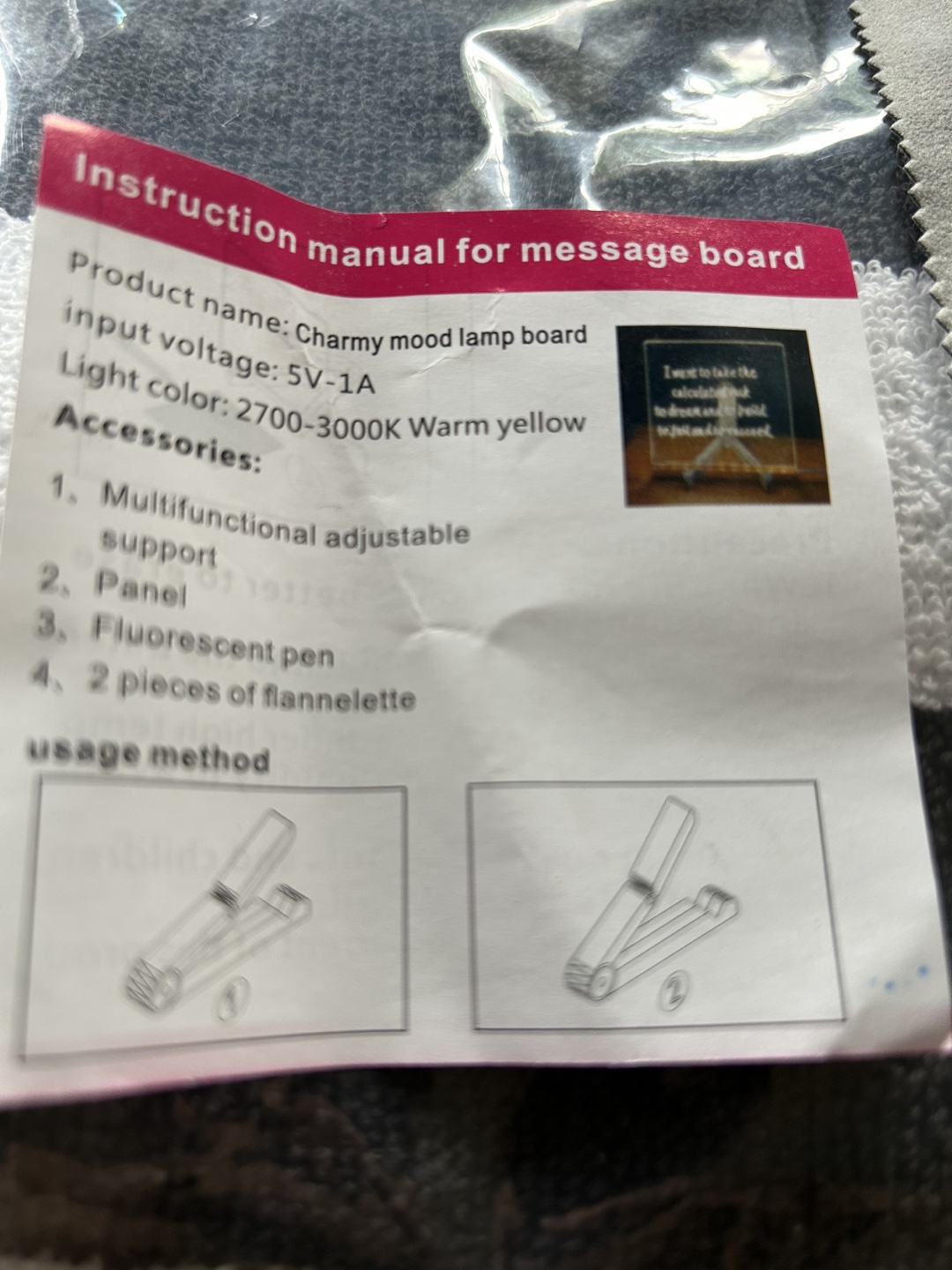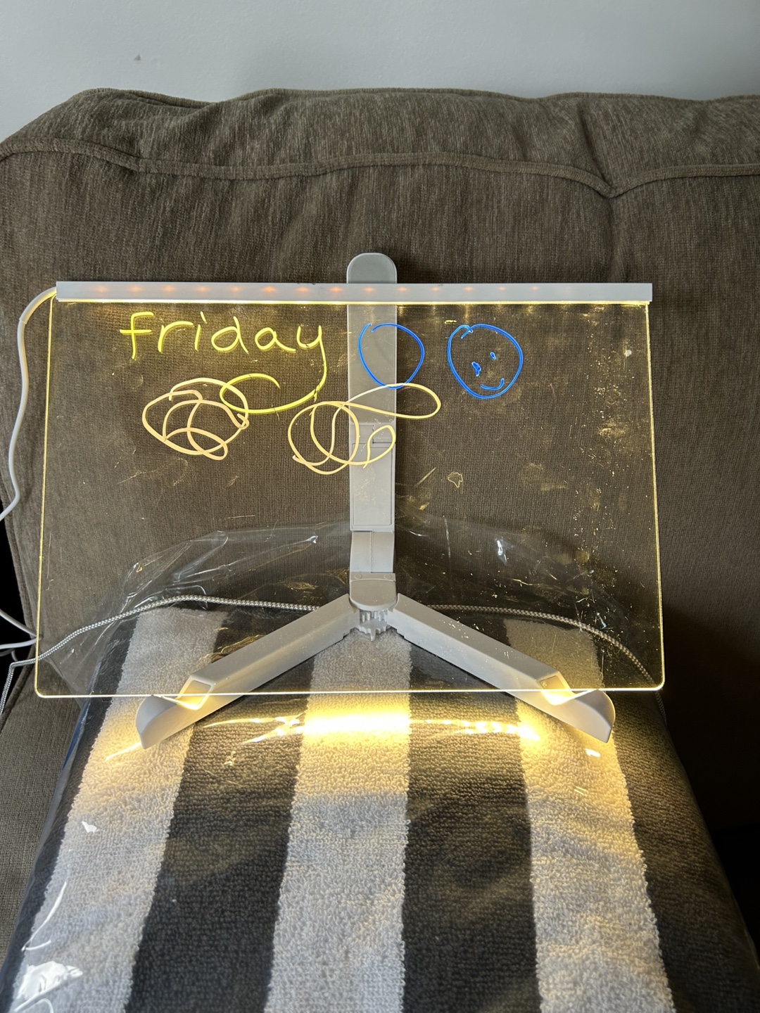 This is a fun LED message writing board! It comes with a stand and is perfect for leaving notes or drawing little pictures. It looks like it's in great condition and ready for a new home