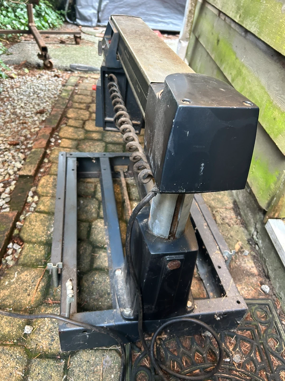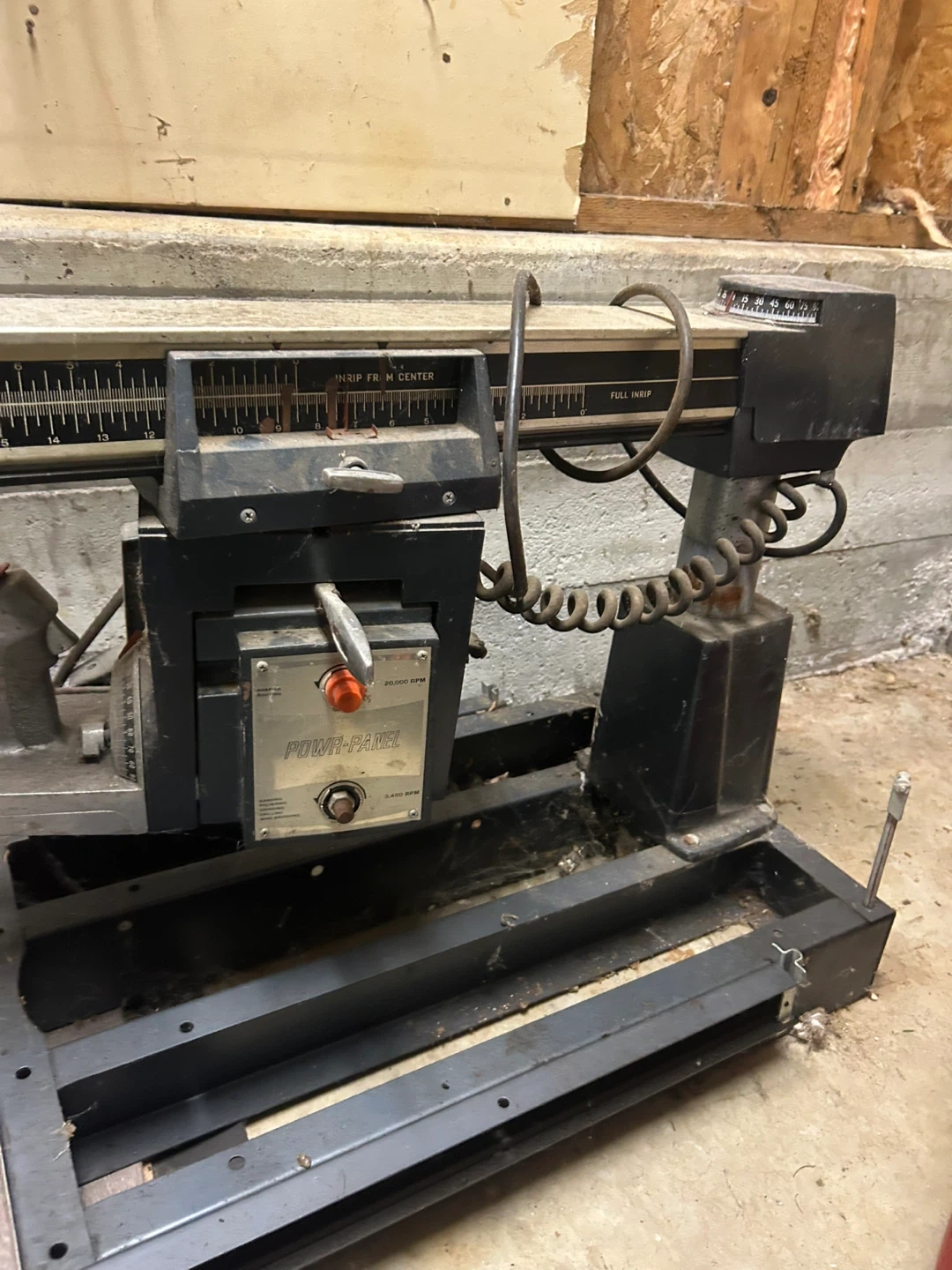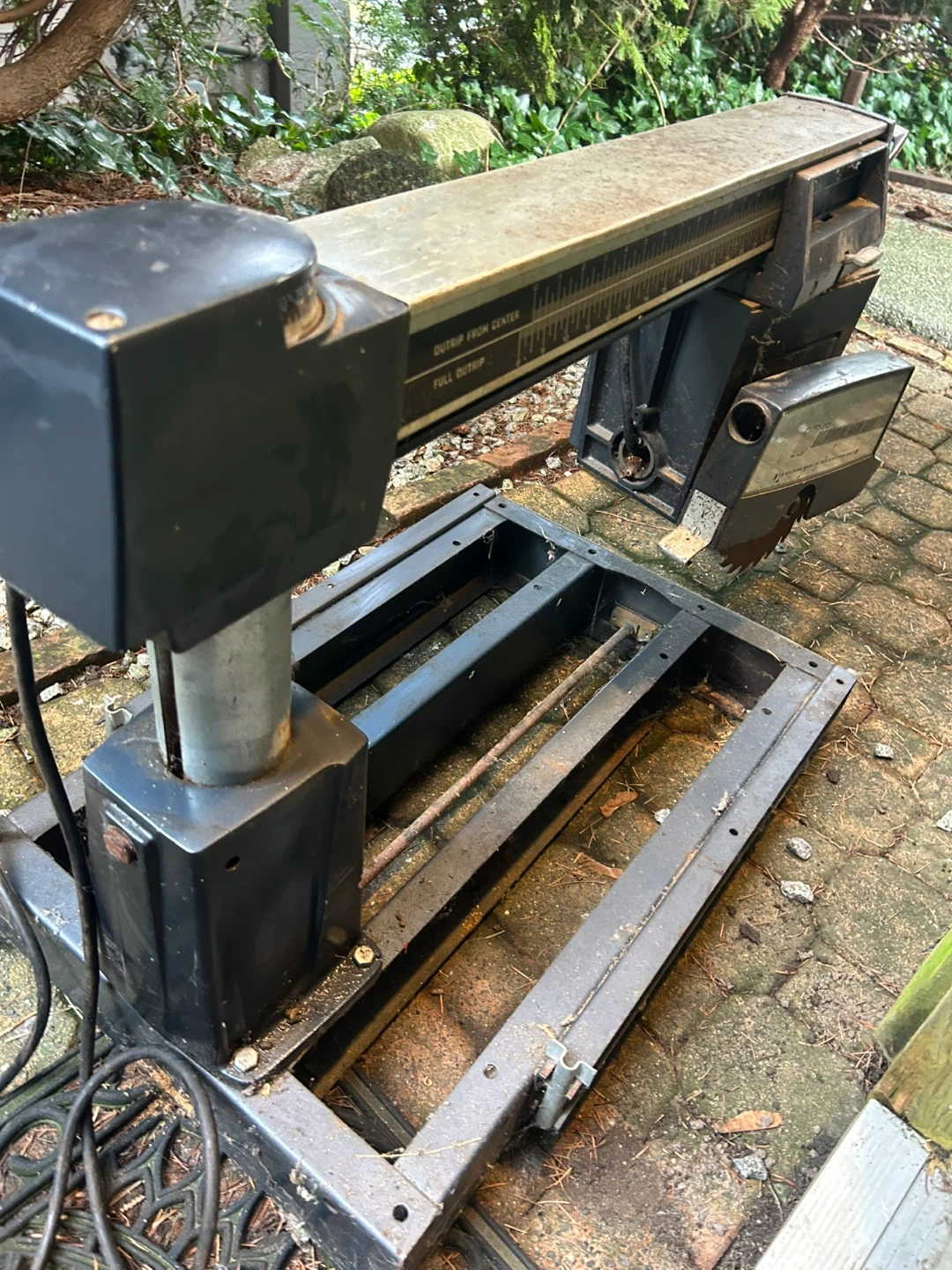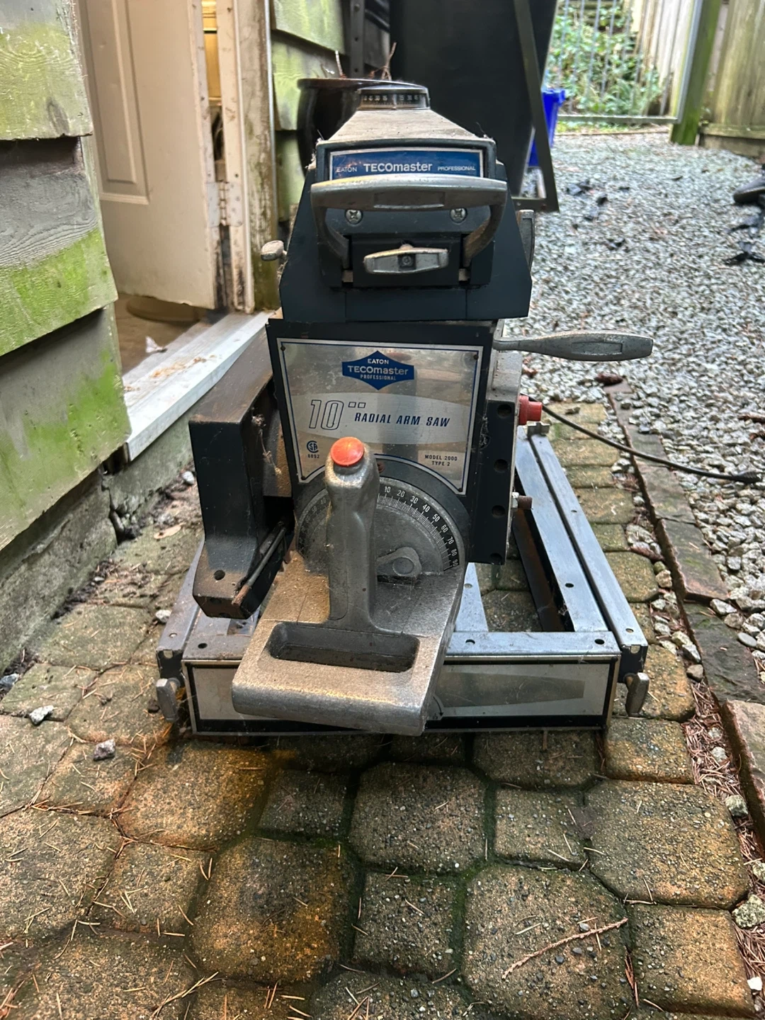 This is a TECOMASTER 10-inch radial arm saw. It features a durable metal construction and comes with its original stand. This saw is great for various woodworking projects.