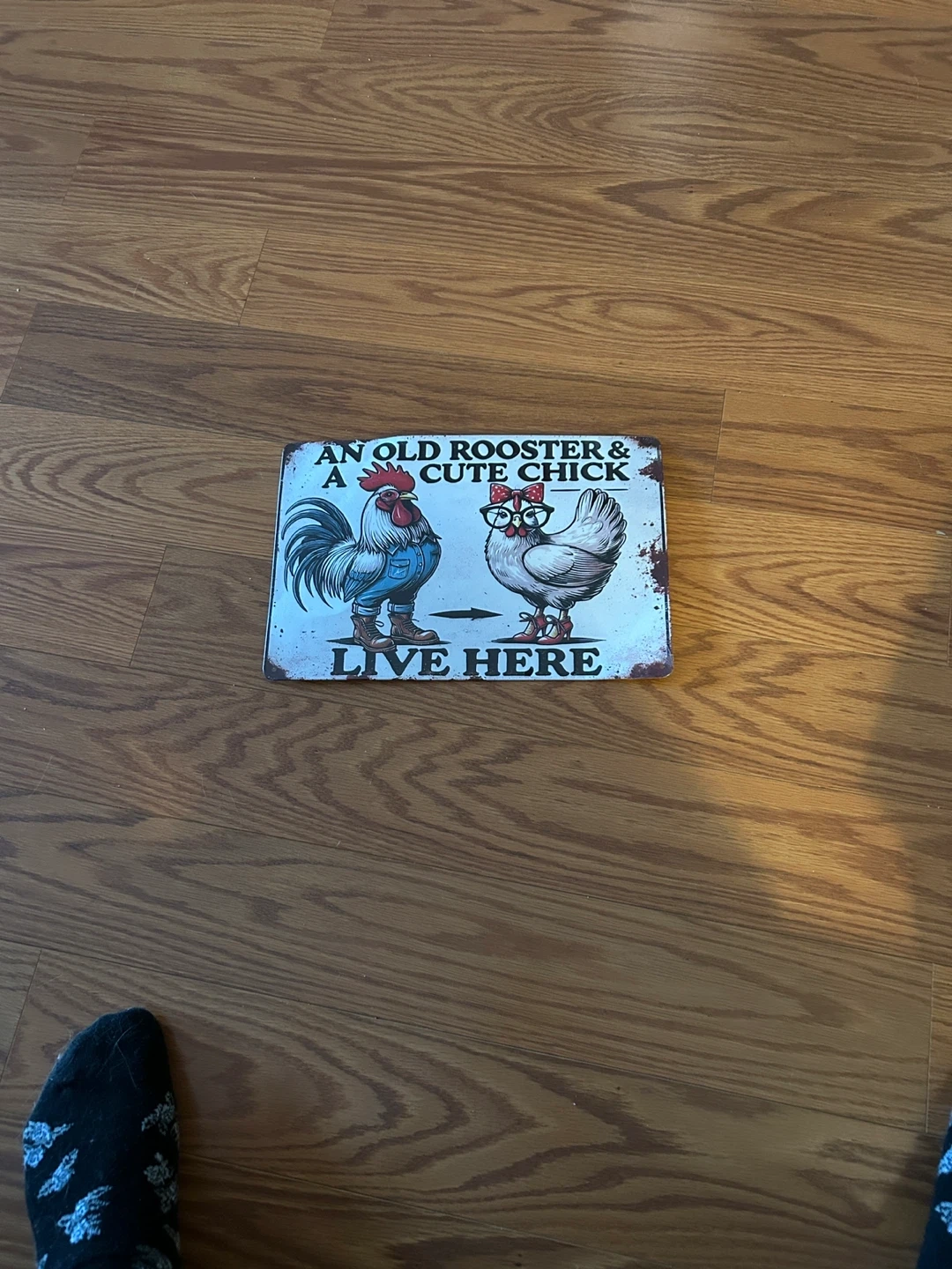 An Old Rooster & A Cute Chick Live Here Metal Sign