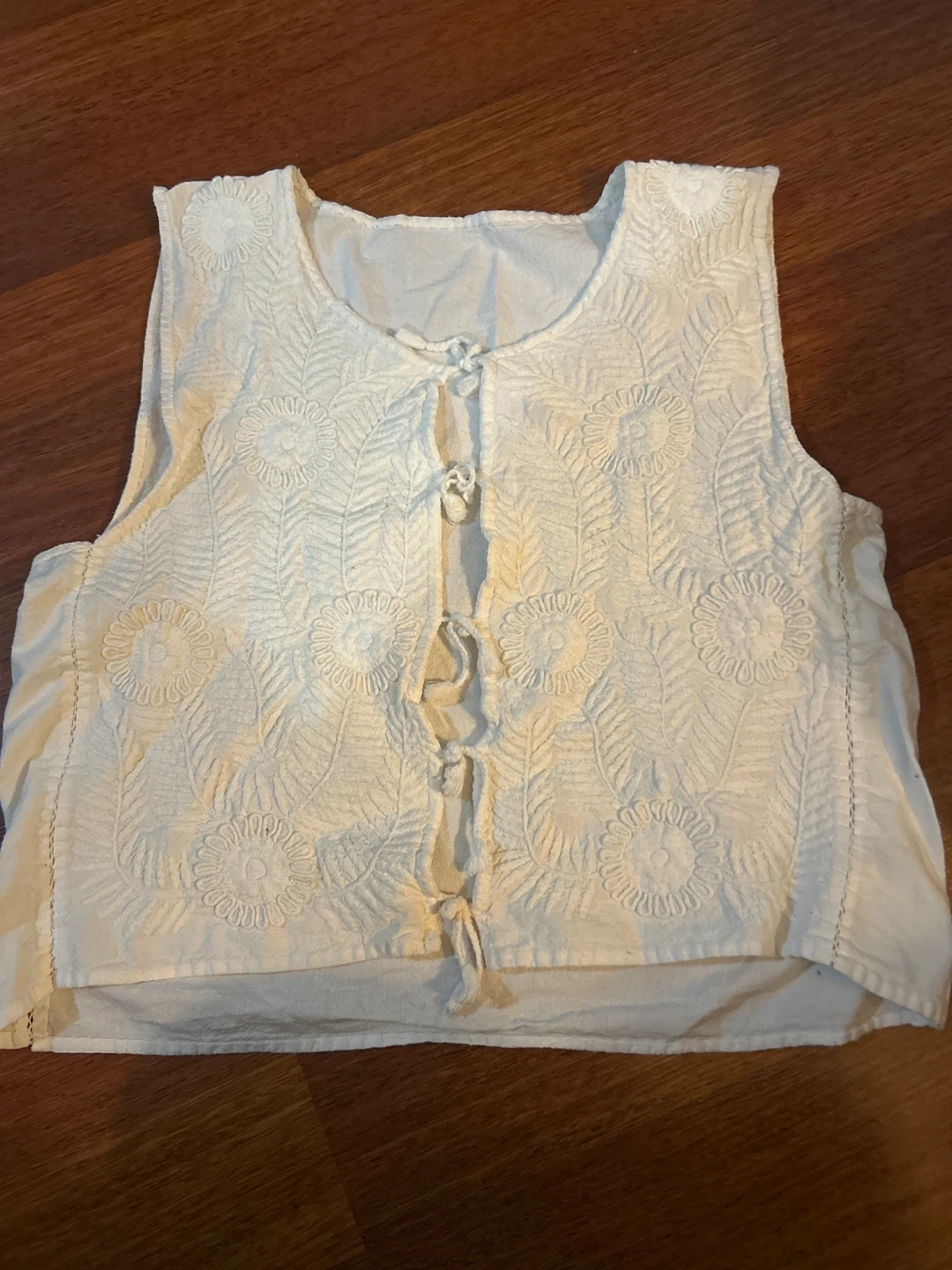 Brand New! This is a white sleeveless vest featuring intricate floral and leaf embroidery. It has tie closures down the front. The material appears to be a lightweight cotton blend. It's perfect for layering over tops for a touch of bohemian style. Size M