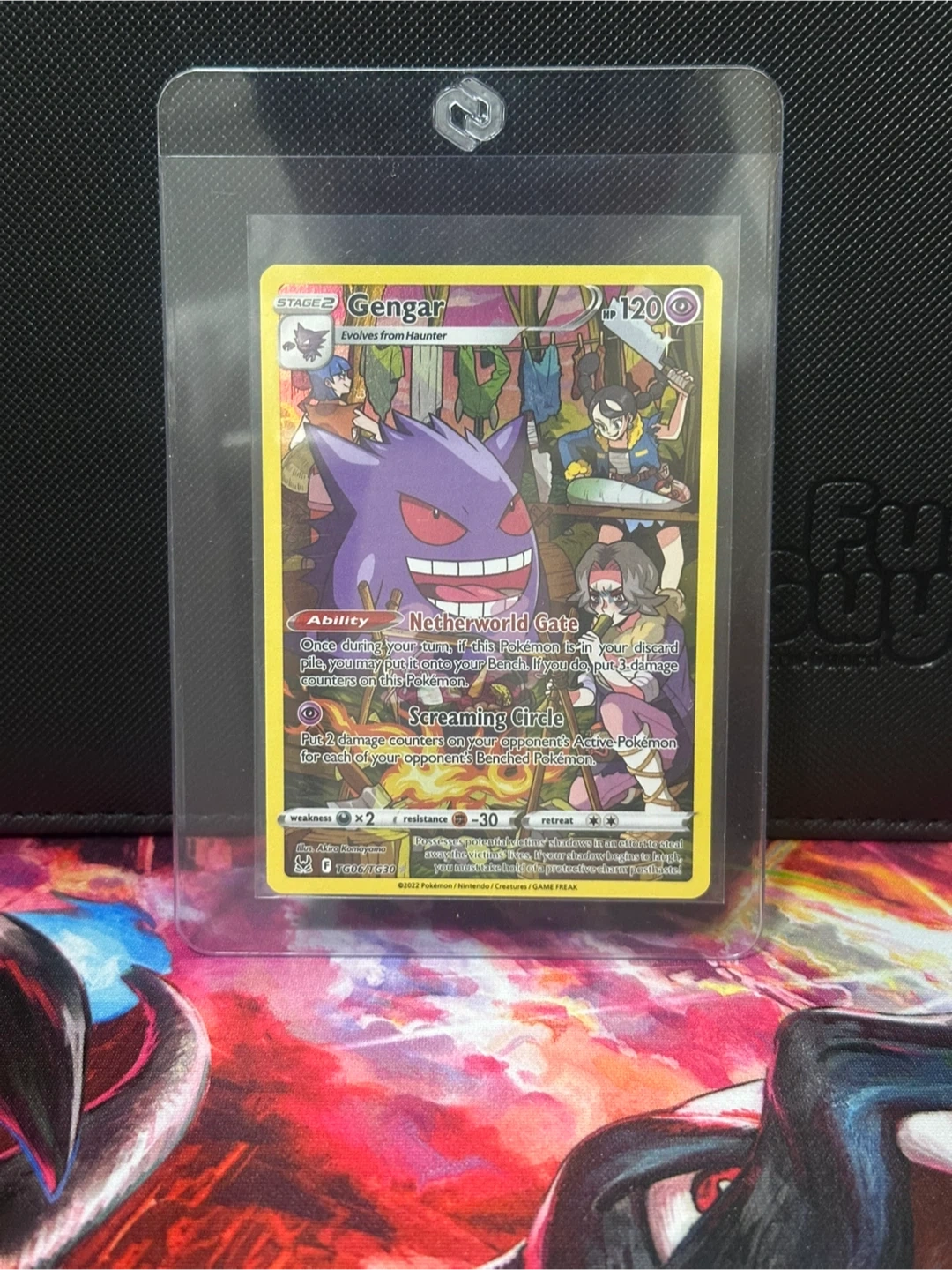 This is a Pokemon Gengar trading card, number tg06/tg30. It's an Ultra Rare trainer gallery card with the ability Netherworld Gate and attack Screaming Circle. It's in a protective sleeve, ready for your collection!