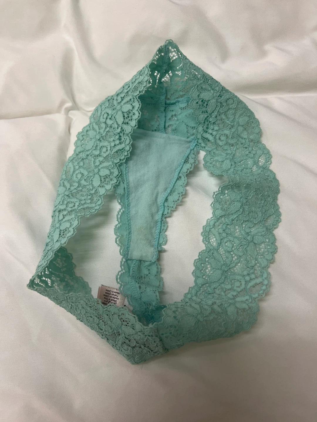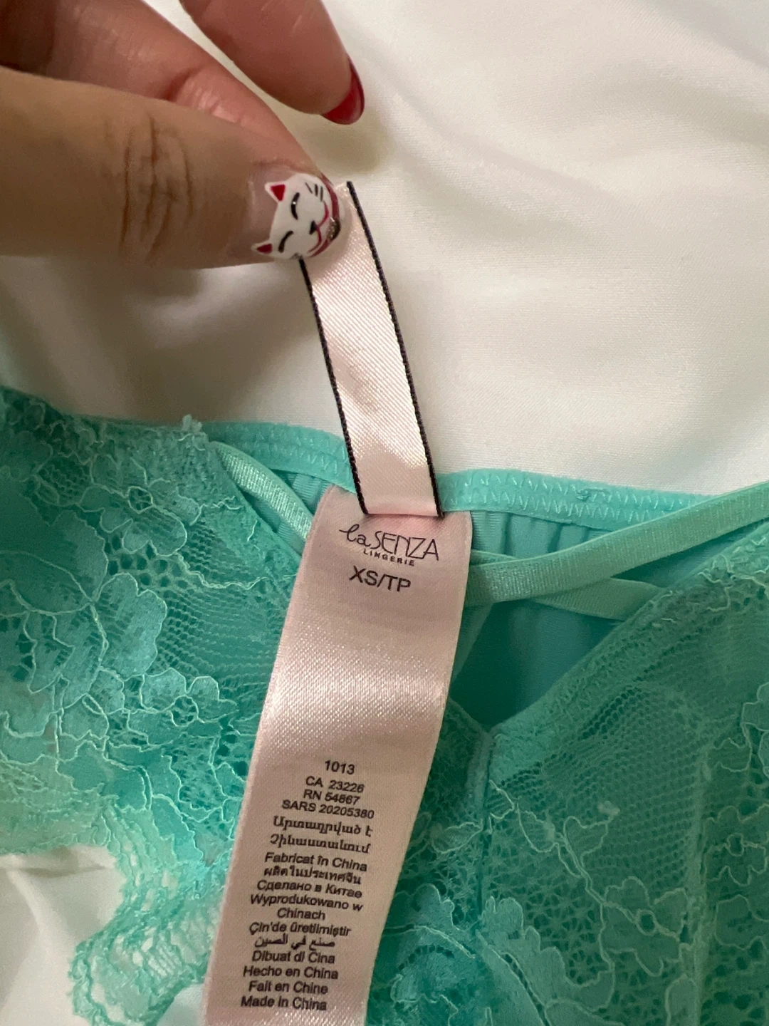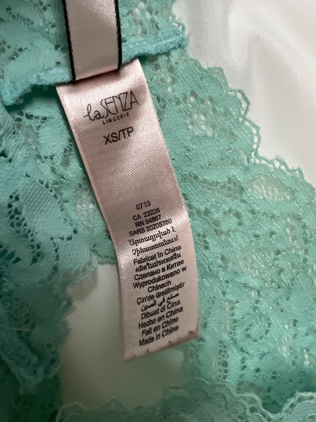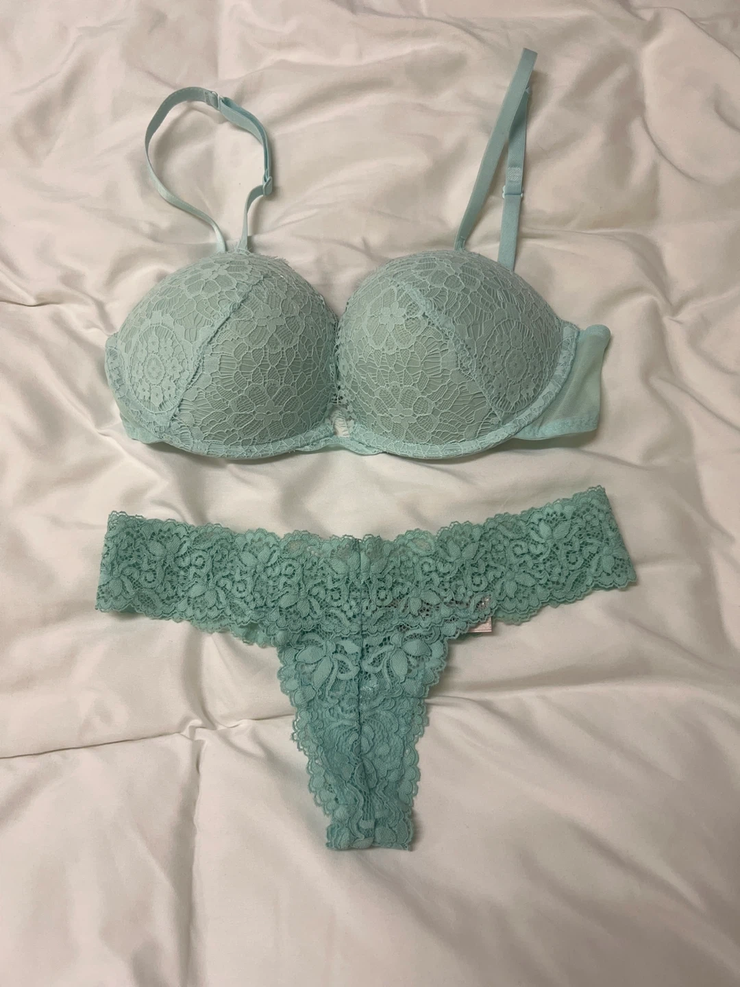 Lovely teal bra and thong set from La Senza. The bra is a push-up style with lace detailing and adjustable straps. The matching thong features a lace waistband. Both are size XS/TP.