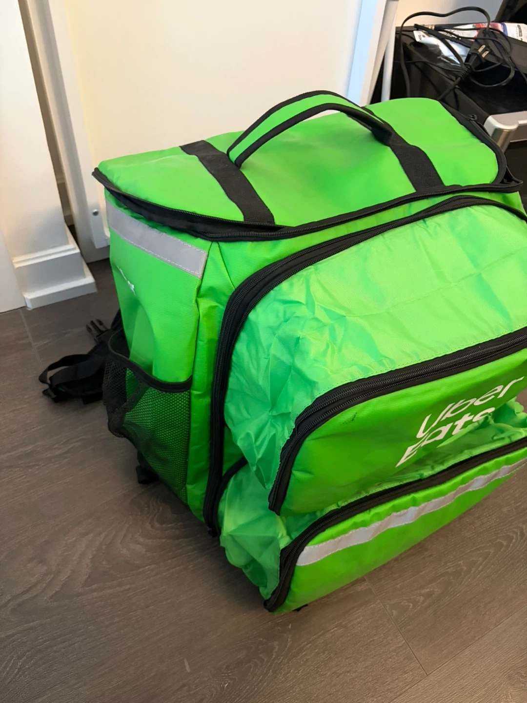 This is an Uber Eats branded delivery backpack. It's bright green with reflective strips for visibility. The bag has multiple pockets and padded straps for comfort. It's a great bag for food delivery drivers!