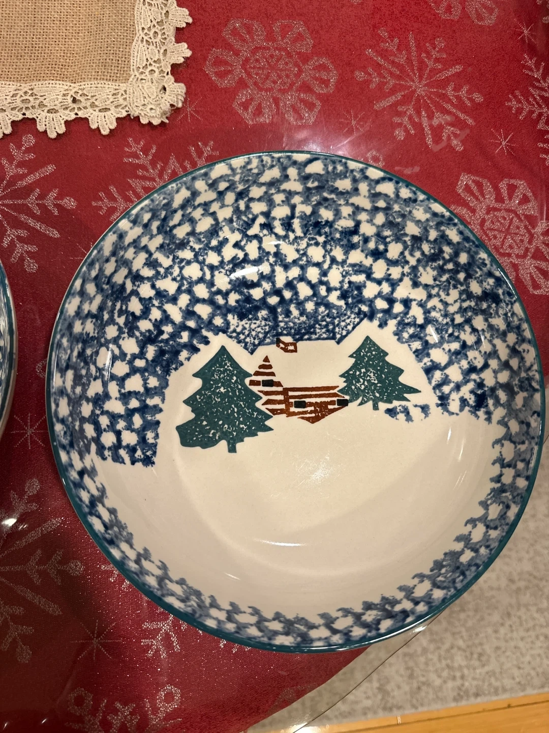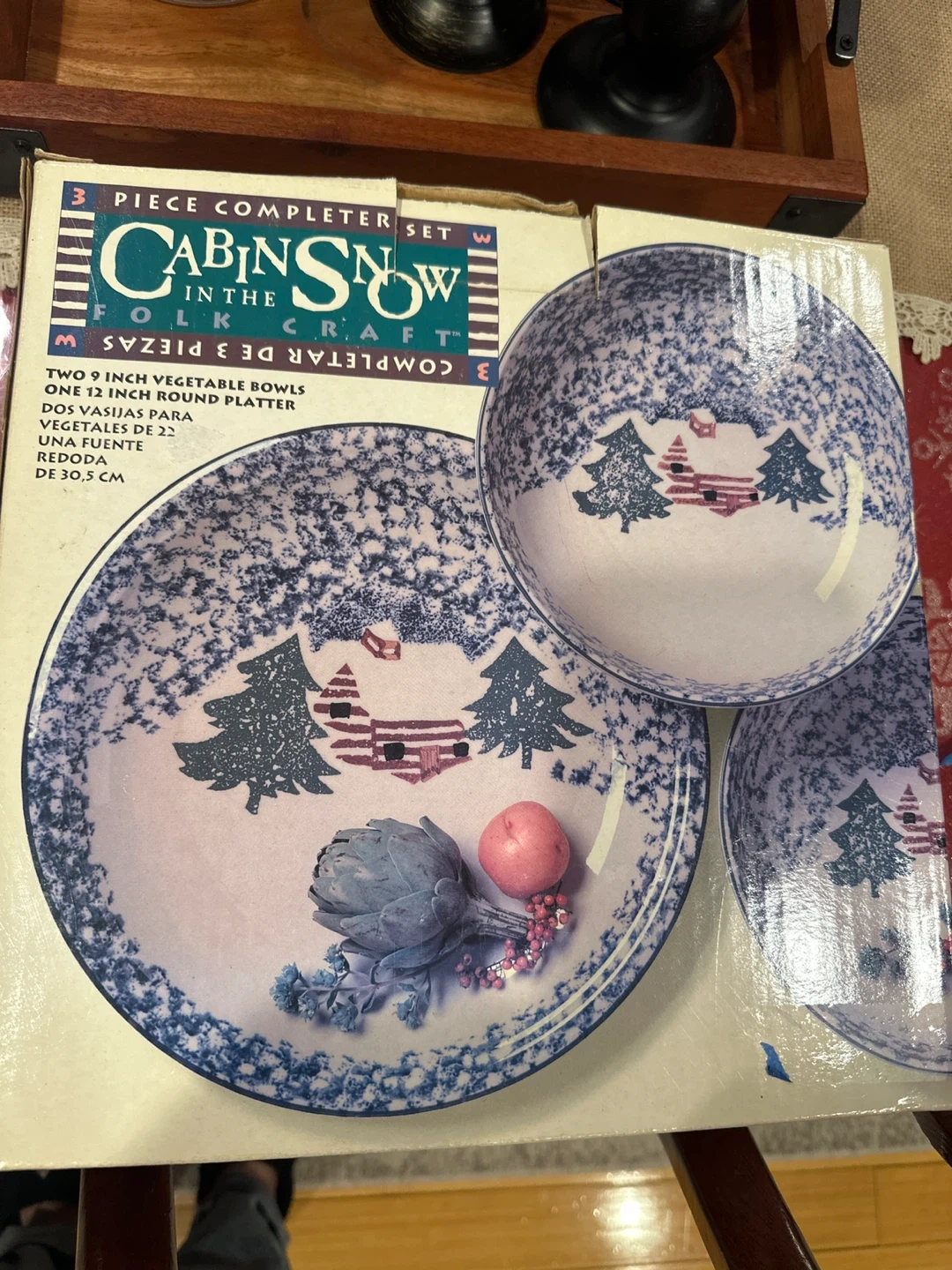 Selling a charming Cabin in the Snow 3-piece serving set by Folk Craft. This set includes two 5-inch vegetable bowls and one 12-inch round platter. Perfect for adding a festive touch to your table!