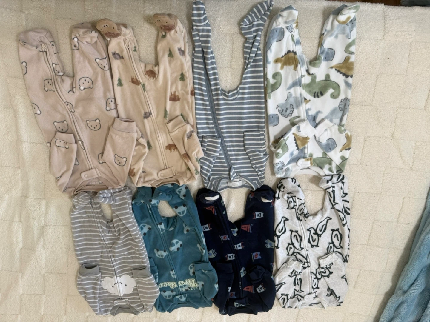 A set of Carter's footie pajamas in various sizes. Includes animal, dinosaur, striped, and cloud prints. Made from soft material for comfortable sleep. Newborn