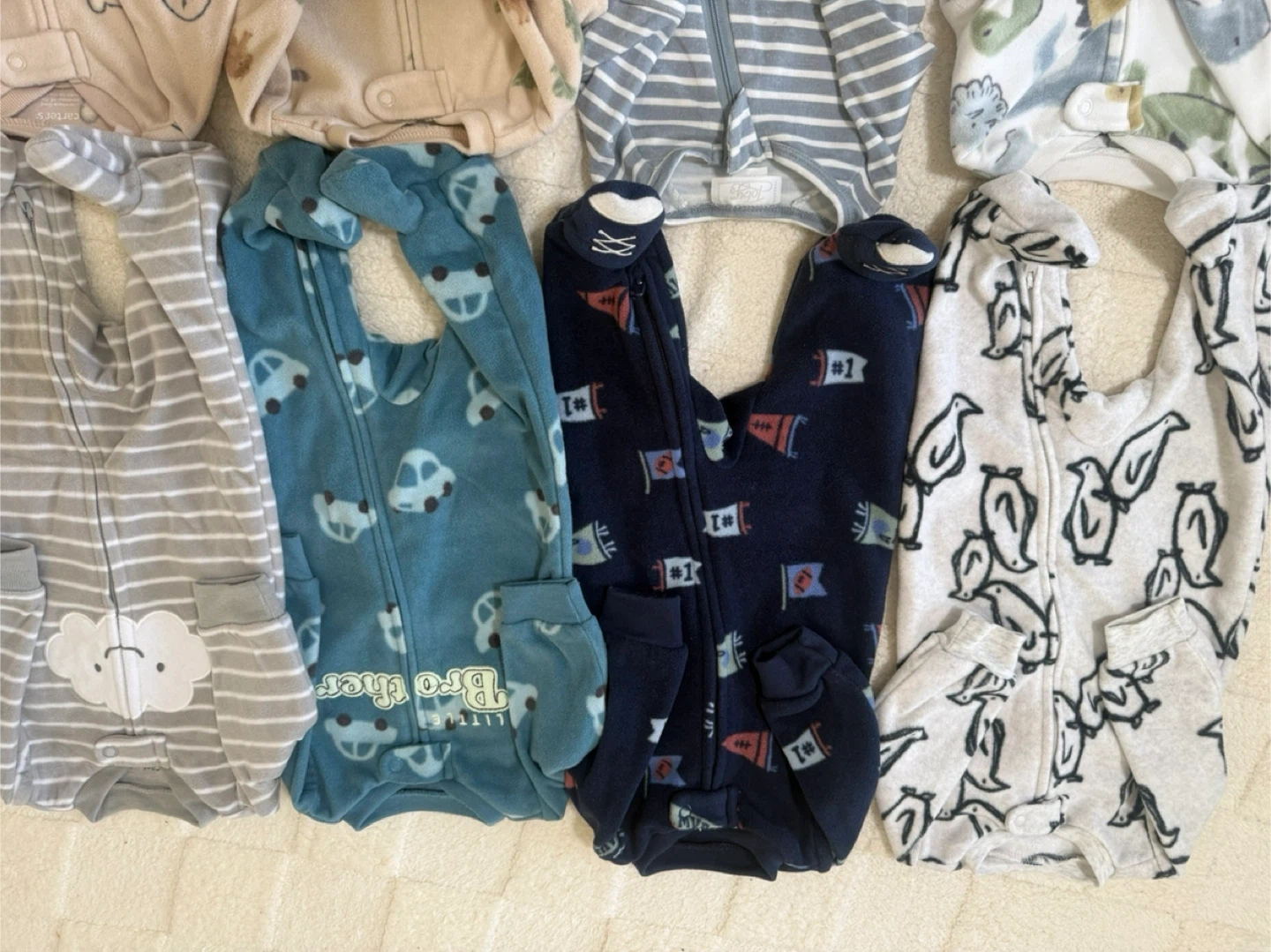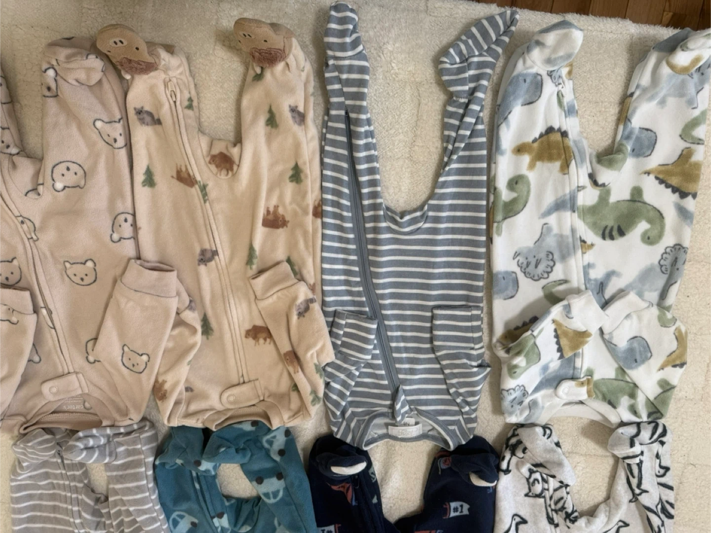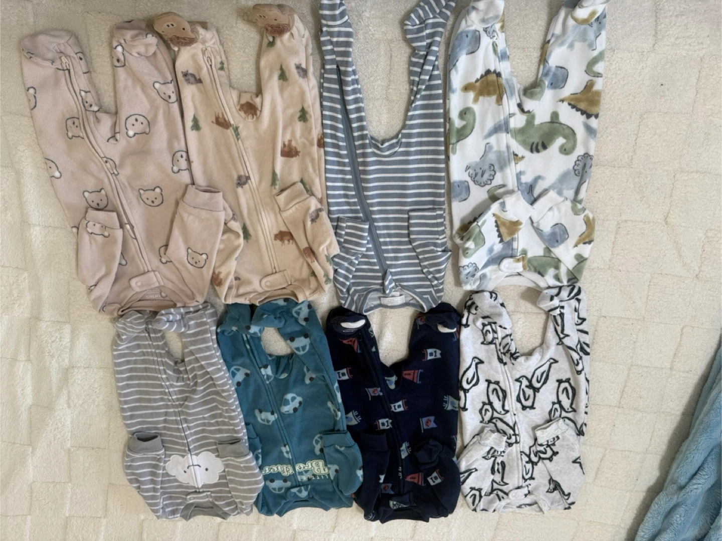 A set of Carter's footie pajamas in various sizes. Includes animal, dinosaur, striped, and cloud prints. Made from soft material for comfortable sleep. Newborn