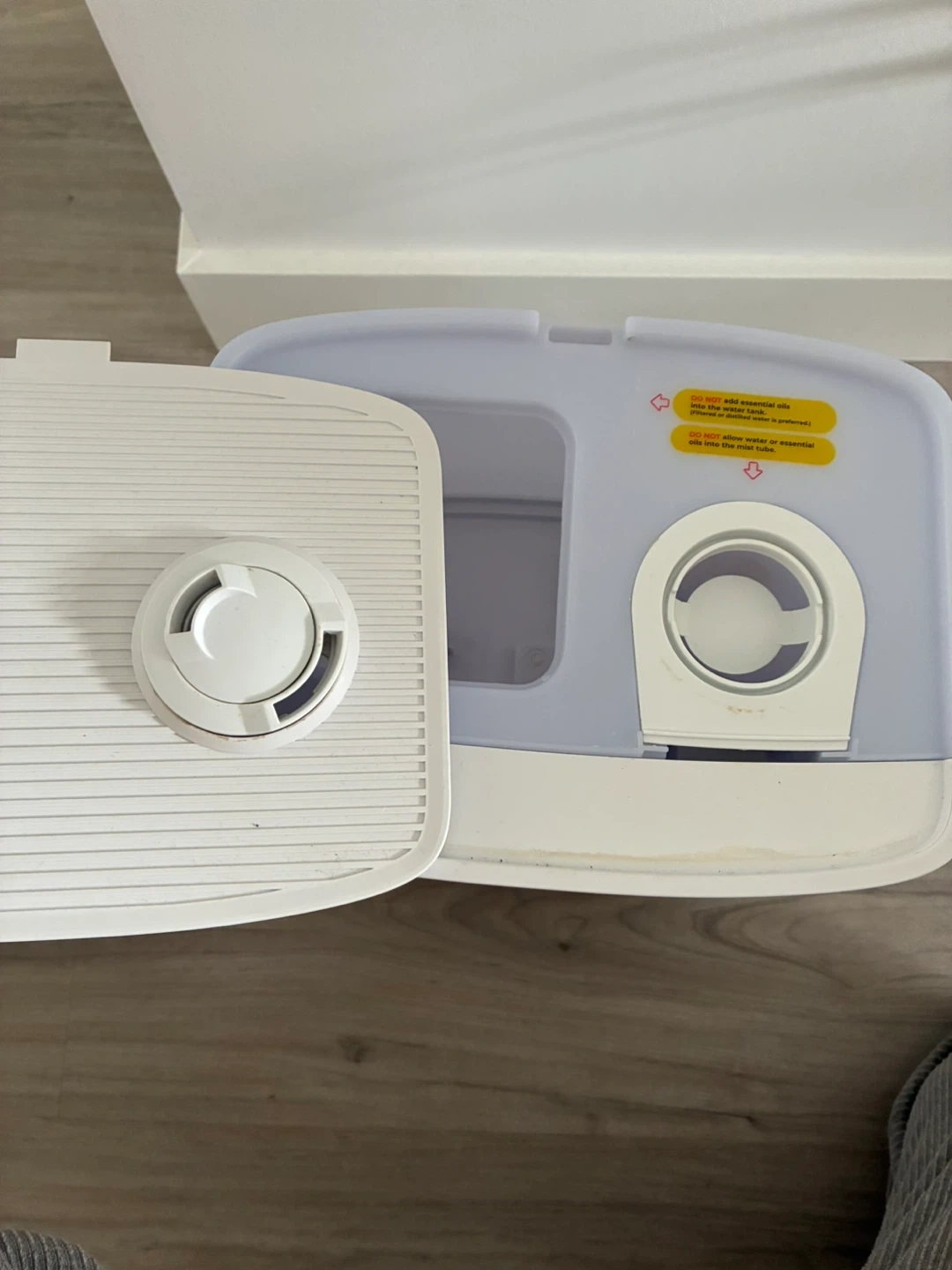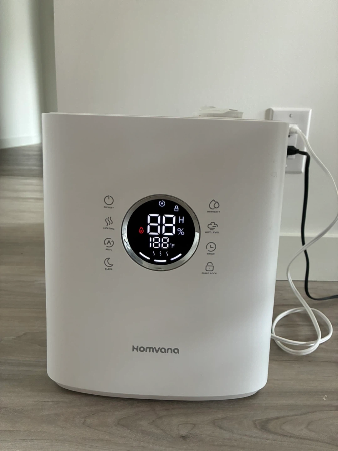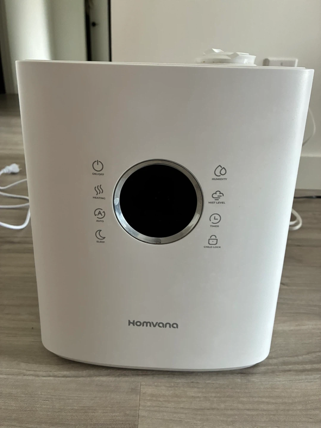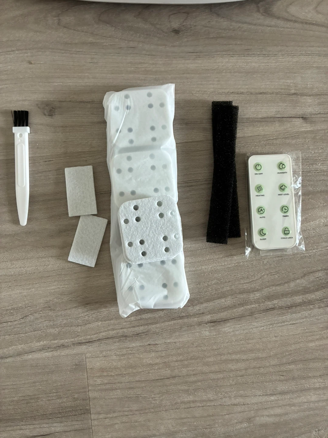 Homvana humidifier with essential oil tray and remote control. Includes cleaning brush, extra filters, and a foam piece. Features heating, auto, sleep modes, and adjustable mist levels.