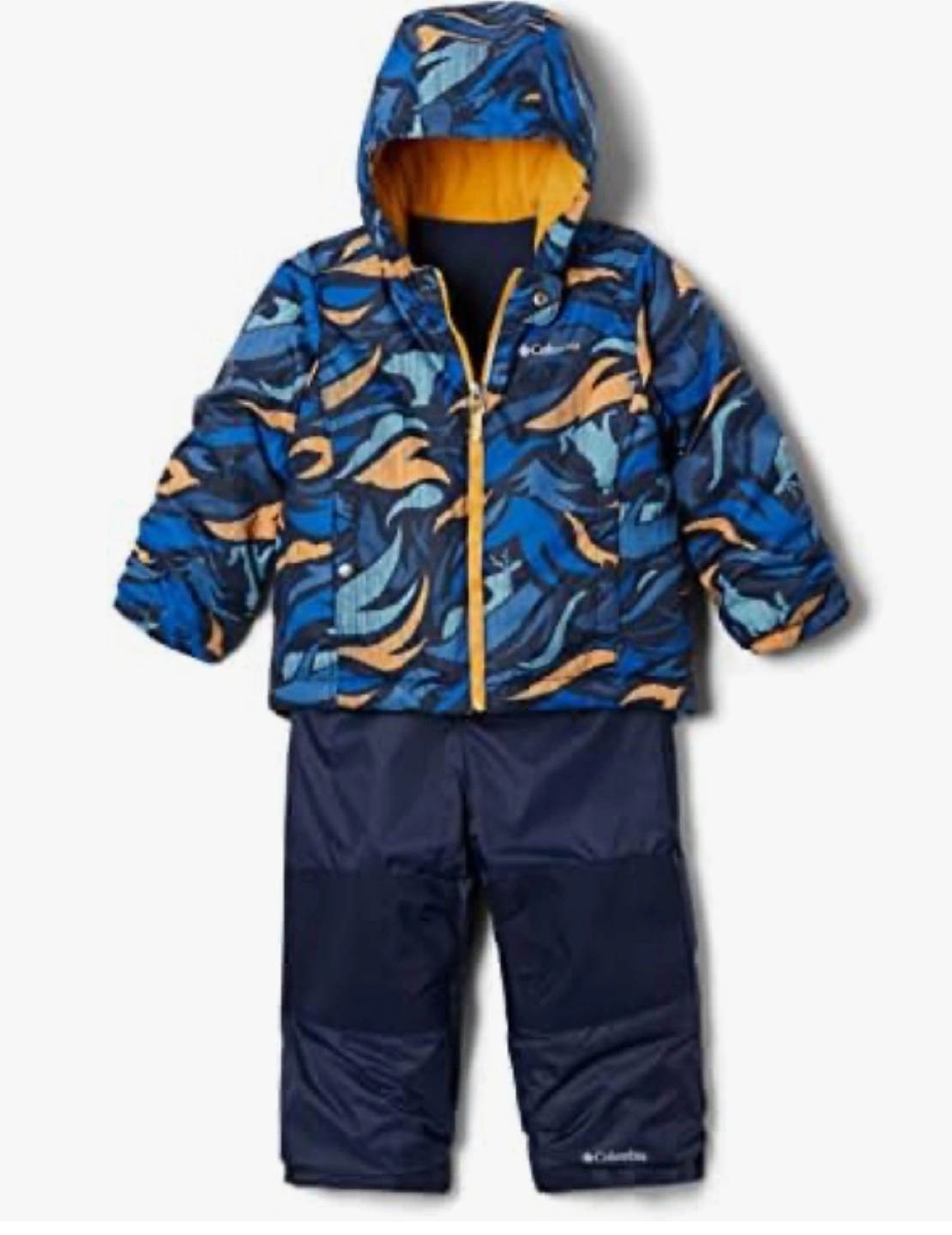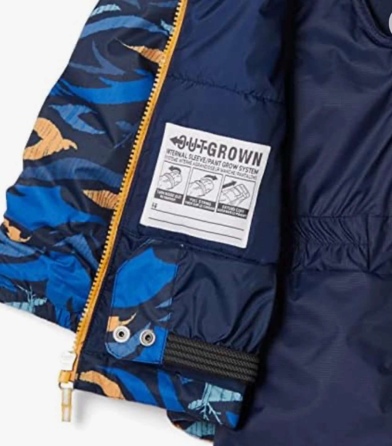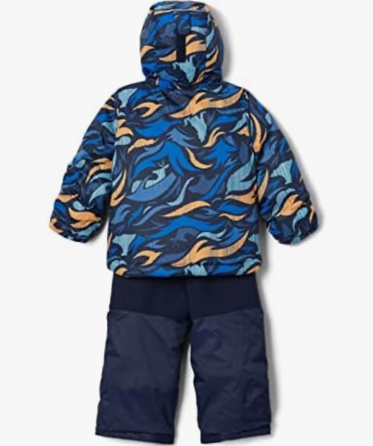 Blue snowsuit with a blue and orange patterned jacket. Features an internal sleeve/pant grow system.